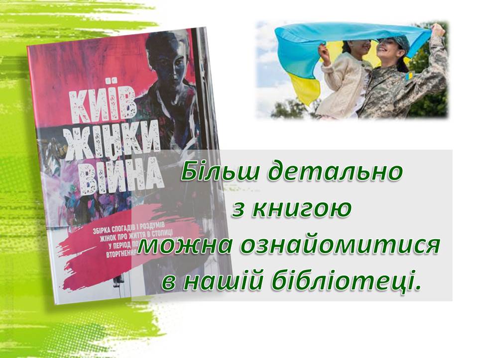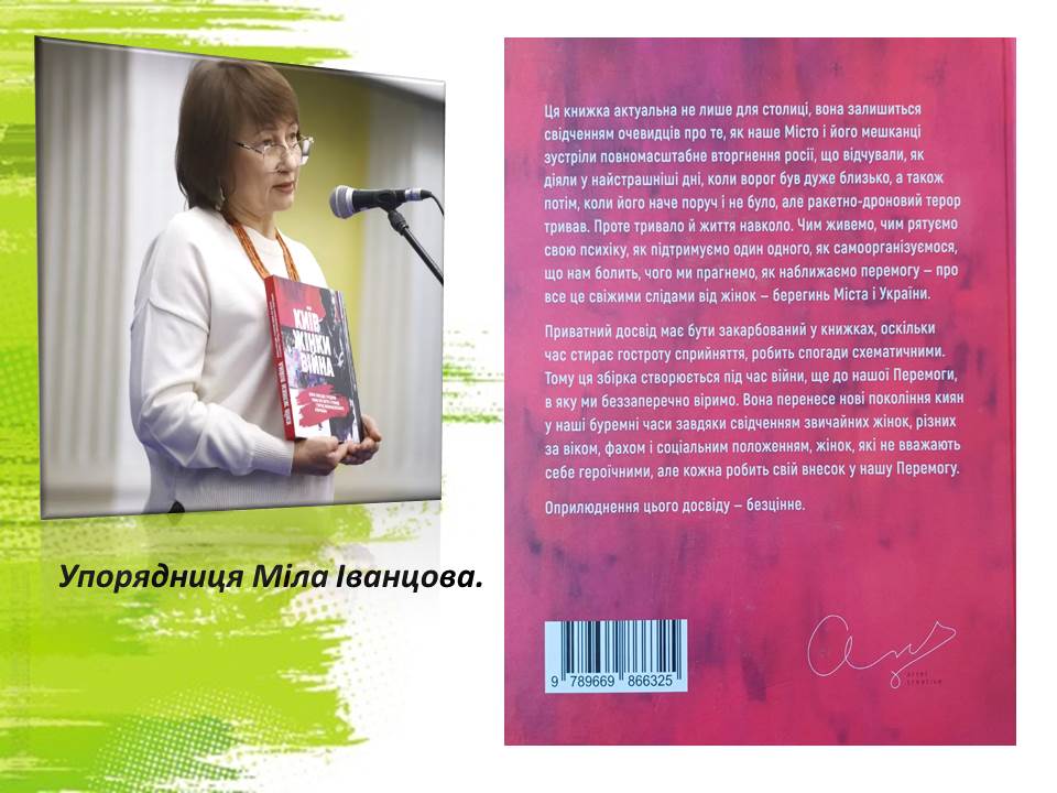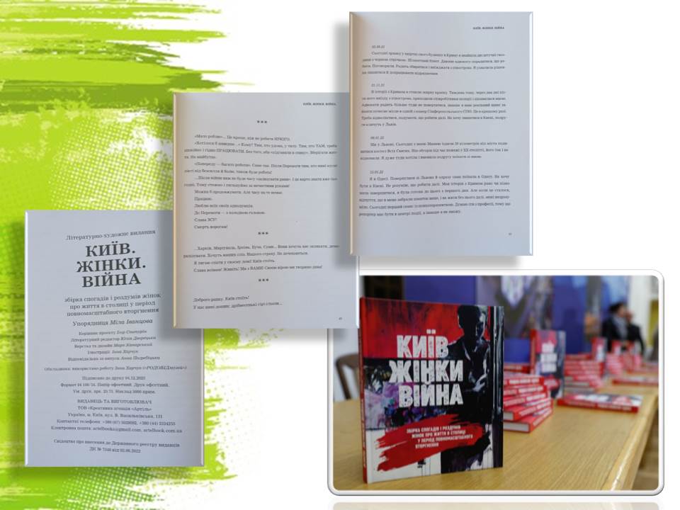 Київ. Жінки. Війна : зб. спогадів і роздумів жінок про життя в столиці у період повномасштабного вторгнення / [упоряд., передм. М. Іванцова]. – Київ : Артіль, 2023. – 225 с.
