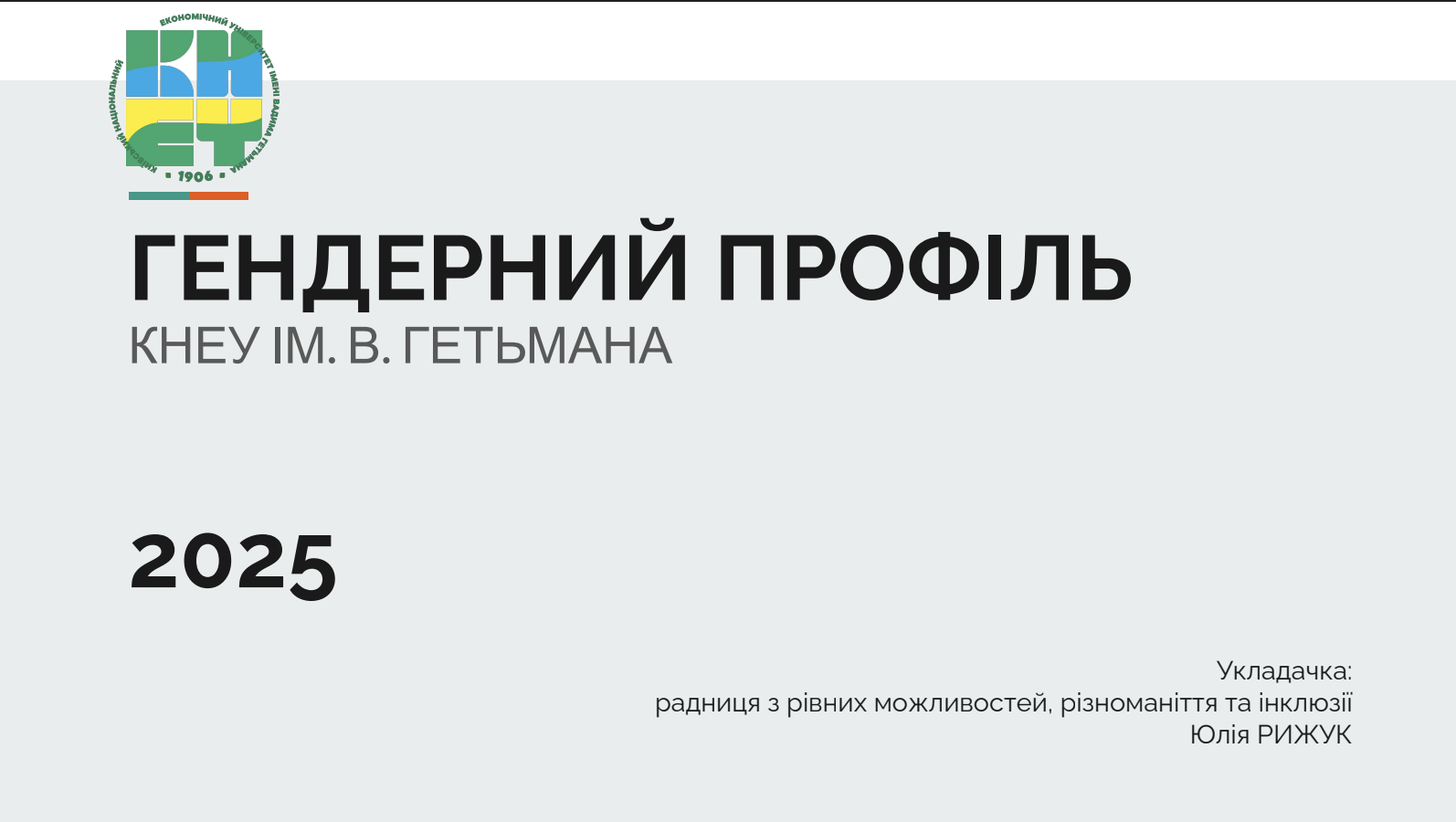 Так, Київський національний економічний університет імені Вадима Гетьмана характеризується переважанням жінок серед здобувачів вищої освіти (60,9%) та працівників, де 69,4% складають жінки. Це високий рівень жіночої представленості, що вказує на широкі можливості для жінок як у здобутті вищої освіти, так і у науково-педагогічній діяльності, а також на загальноукраїнську тенденцію фемінізації вищої освіти. У топ адміністрації КНЕУ ім. В. Гетьмана спостерігається різноманітність гендерного складу. Чоловіки переважають у складі ректорату та керівництві інститутів / факультетів, проте, жінки – у керівництві структурних підрозділів та кафедр, а також представлені у інших посадах Університету (Комісія з етики, уповноважений з антикорупційної діяльності, тощо) та колегіальних органах Університету (Вчена рада Університету, Науково-методична рада, Науково-експертна рада, тощо). Гендерний паритет може сприяти більшій різноманітності й ефективності управління Університетом. Загальний гендерний розподіл в таких категорій працівників Університету, як робітники (адміністративно-господарська частини) та спеціалісти (навчально-допоміжний персонал) показує незначне переважання жінок, в цілому, в той же час, на технічних та охоронних посадах, більше чоловіків. Серед усіх здобувачів Університету, студенток в середньому більше на 21,8%, ніж студентів. Тенденція розподілу здобувачів за рівнями освіти спостерігається наступна: серед студентства бакалаврату студенток на 25,2 % більше, ніж студентів, а на магістратурі – на 9,1% студенток менше, ніж студентів. Загальний рівень первинної документації КНЕУ ім. В. Гетьмана на предмет гендерної чутливості знаходиться на достатньому рівні, що підтверджується результатами проведеного дослідження щодо задоволеності умовами врахування у освітньому просторі принципу забезпечення рівних прав та можливостей жінок і чоловіків в КНЕУ ім. В. Гетьмана. Більшість учасників освітнього процесу в КНЕУ ім. В. Гетьмана вважають, що Університет є середовищем із гендерною рівністю, переважна більшість представників студентської спільноти та науково-педагогічних працівників не стикались з проявами гендерної нерівності.
