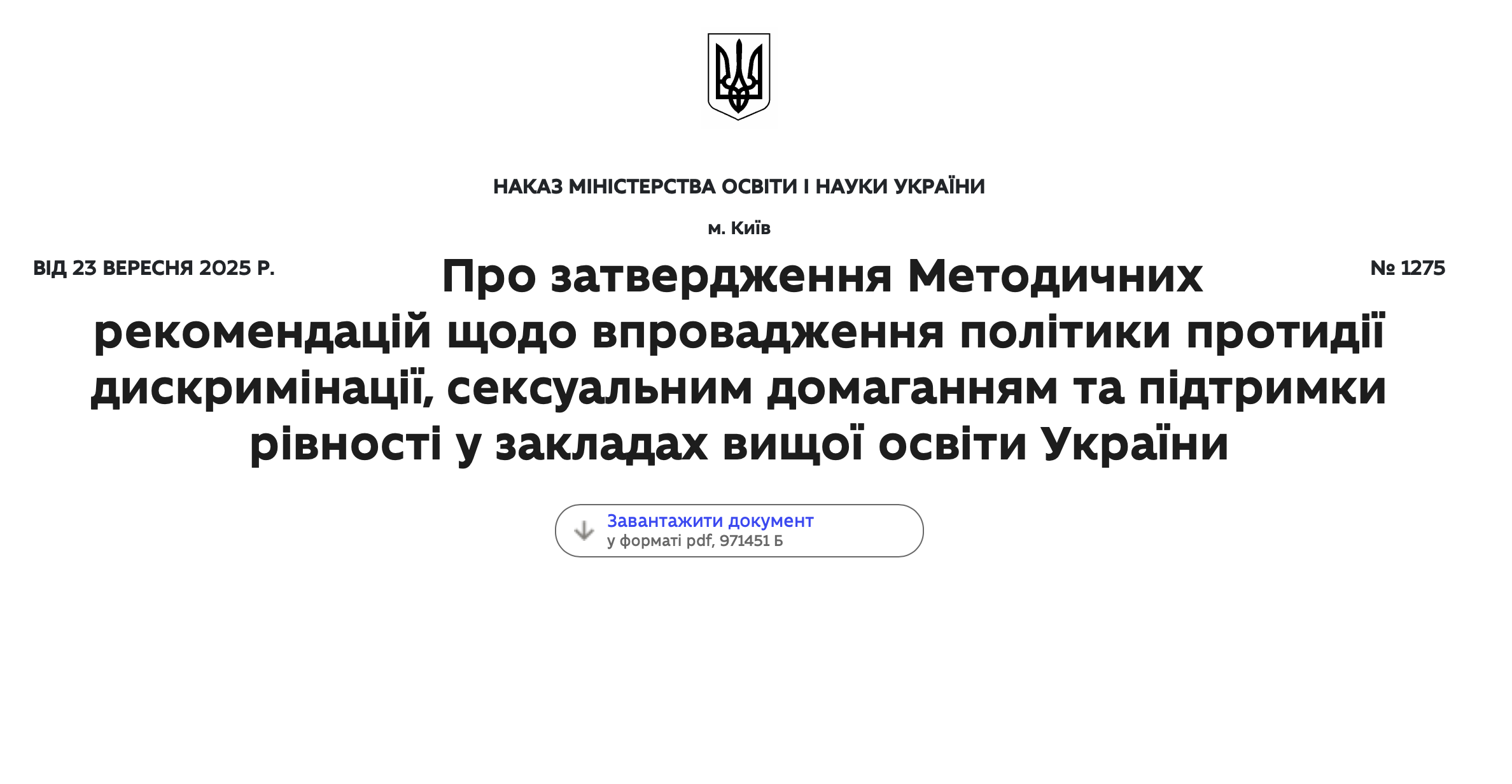 Міністерство освіти і науки України затвердило Методичні рекомендації щодо впровадження політики протидії дискримінації, сексуальним домаганням та підтримки рівності у закладах вищої освіти України10 Жовтня 2025р.![]() Міністерство освіти і науки України затвердило Методичні рекомендації щодо впровадження політики протидії дискримінації, сексуальним домаганням та підтримки рівності у закладах вищої освіти України (наказ №1275 від 23 вересня 2025 року). Цей наказ, зокрема, передбачає його доведення до закладів вищої освіти для врахування під час розроблення та впровадження внутрішніх положень, процедур і заходів, спрямованих на створення безпечного інклюзивного та недискримінаційного освітнього середовища.