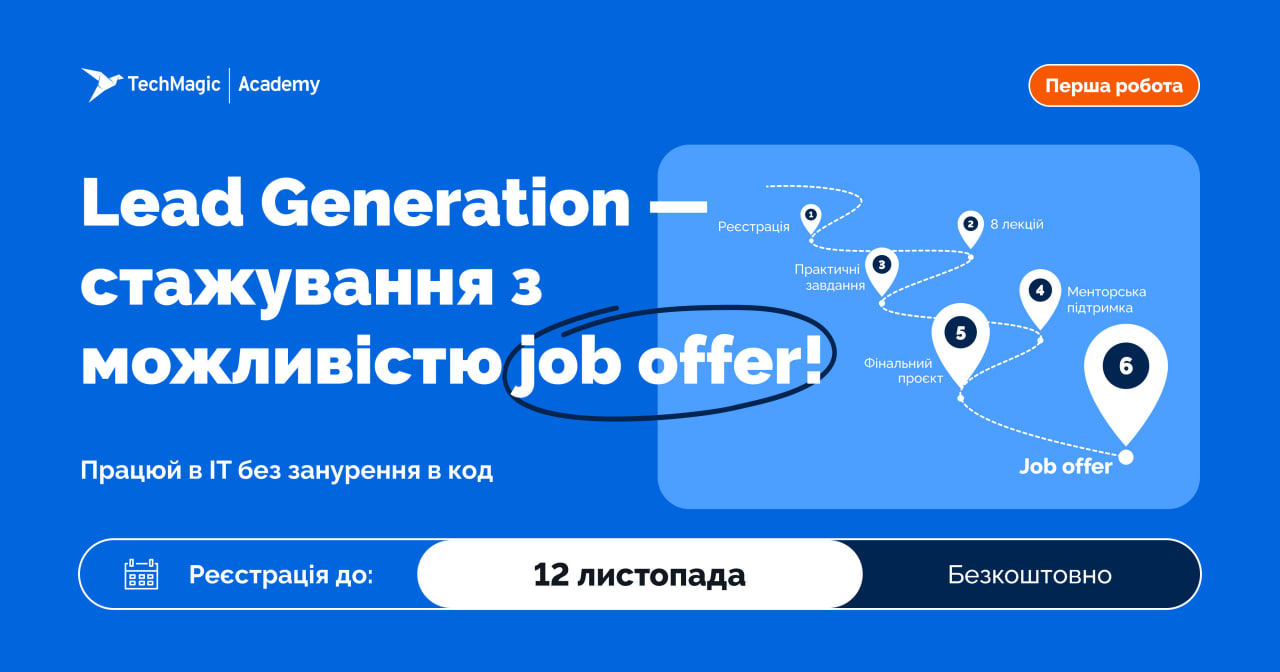 Ми розпочали новий набір на курс в напрямку ІТ-продажів – “Lead Generation”. Це безкоштовний 4-тижневий інтенсив, після якого найкращі студенти можуть отримати роботу в компанії у нас як Junior Lead Generation Specialist в команді Sales&Marketing.
