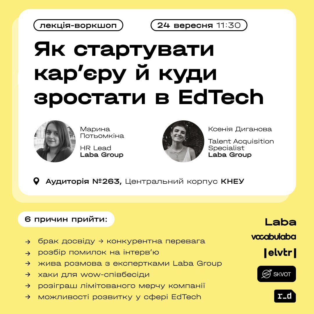 Лекція-воркшоп «Як стартувати кар’єру й куди зростати в EdTech» 24.09.202424 Вересня 2024р.![]() #заходи_перспектива ❓ Як перетворити брак досвіду на конкурентну перевагу? Що говорити на співбесіді, аби виглядати переконливо перед роботодавцем? Про це і більше розкажемо на лекції-воркшопі «Як стартувати кар’єру й куди зростати в EdTech». 🎤 Active voices — експертки з EdTech-компанії Laba Group: Ксенія Диганова, Talent Acquisition Specialist, поділиться хаками, як оформити переконливе CV, справити правильне враження на співбесіді та уникнути найчастіших помилок, яких припускаються кандидат(к)и; Марина Потьомкіна, HR Lead, розповість про кар’єрні можливості у сфері і про те, як все влаштовано у компанії Laba Group. 🎁 Ти зможеш взяти участь в інтерактивному квізі та позмагатися за лімітовану колекцію нашого мерчу й +1 секретний приз від Laba. 🏡 Зустрінемося в аудиторії №263 Центрального корпусу КНЕУ. ⏰ Стартуємо о 11:30 вже 24 вересня. Якщо ти: 🔹 вперше шукаєш роботу; 🔹 хочеш здобути бажану посаду, але не знаєш, як це зробити; 🔹 плануєш свою кар’єру та досліджуєш можливості на ринку праці; 🔹 слідкуєш за брендами Laba Group і хочеш дізнатися більше про нас. Тоді тобі точно до нас! 🔗 Участь безплатна та за попередньою реєстрацією. Переходь за посиланням. 🔥 До зустрічі 24 вересня! |