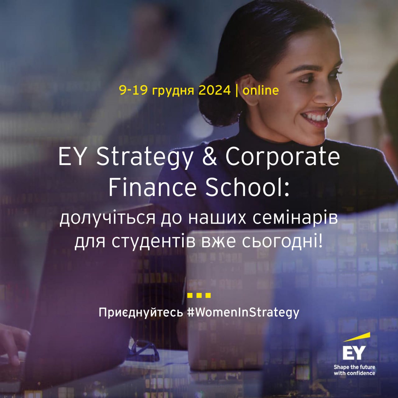 EY Strategy & Corporate Finance School02 Грудня 2024р.💡 Шукаємо майбутніх лідерок бізнес-індустрії!! Готові стати провідниками у світі стратегії та корпоративних фінансів? 🌟 Приєднуйтеся до EY Strategy & Corporate Finance School та розкрийте свій потенціал! 👩🎓 Для студентів 2-3 курсів бакалаврату або магістратури з усієї Європи, які володіють англійською мовою та цікавляться стратегією і корпоративними фінансами. Отримайте нові навички, офіціний сертифікат EY та можливість познайомитися з провідними професіоналами з усієї Європи. Реєструйтеся вже зараз 👉 bit.ly/3B3w2GW #EYStrategyandCorporateFinanceSchool |
