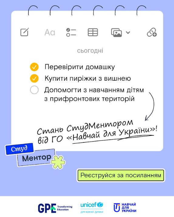 Програма «СтудМентор» від ГО «Навчай для України»14 Лютого 2025р.![]() #можливості_перспектива 🚀 Найкращий час для творення змін — сьогодні. Бо освіта не чекає, а життя — тим паче. 👥 Запрошуємо молодь долучитися до інтелектуального волонтерства та здобути досвід викладання із користю для українських школярів. Програма «СтудМентор» від ГО «Навчай для України» — це програма волонтерства та розвитку, в якій українська молодь вивчає менторинг та застосовує його для викладання шкільних предметів у онлайні для дітей з прифронтових регіонів. Умови участі: 📌 тобі від 18 років; 📌 ти маєш глибокі знання з одного зі шкільних предметів; 📌 готовий/а приділяти програмі 4+ години залученості на тиждень; Формат: 📌 уроки з учнями відбуваються онлайн, двічі на тиждень, по 45 хвилин; 📌 один/а ментор/ка викладає для 1 або 2 груп учнів (одна група — до 3 дітей 5-11 класу); 📌 команда «Навчай для України» забезпечує менторів/ок усіма матеріалами для викладання та постійним супроводом вчителів із досвідом. 🔗 Долучитися до програми «СтудМентор» можна за посиланням. |