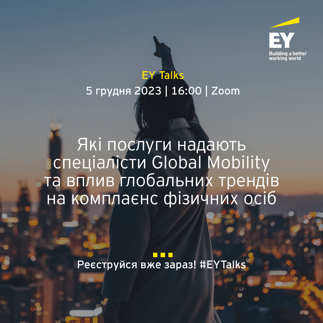 EY Talks28 Листопада 2023р.![]() #можливості_перспектива Із зіткненням трьох тенденцій – складності, швидкості виходу на ринок та глобального охоплення – зростає потреба бізнесу в компетентних спеціалістах з реалізації програм мобільності персоналу 🌍💼 Відкрий світ консалтингу з глобальної мобільності разом з EY Talks та дізнайся: 📌 як спеціалісти команди Global Mobility допомагають клієнтам дотримуватись юридичних та податкових аспектів реалізації програм мобільності 📌 CRS, BEPS, AML: які наслідки виникають для фізичних осіб? 📌 про профіль кандидата і ключові якості, необхідні для побудови кар'єри консультанта Global Mobility. Та це ще не все 🚀 Випробуй власні навички, виконавши профільне тестове завдання! Учасники, які успішно складуть тест, отримають можливість приєднатися до команди Global Mobility EY в Україні. 👥 Кому буде цікаво: студентам та нещодавнім випускникам економічних, юридичних та податкових напрямів освіти. 🗓 5 грудня 2023 🕓 16:00 (UTC+02) 📍 Zoom-конференція з Q&A сесією 🎙 Спікер – Анна Жирун, менеджерка практики People Advisory Services.