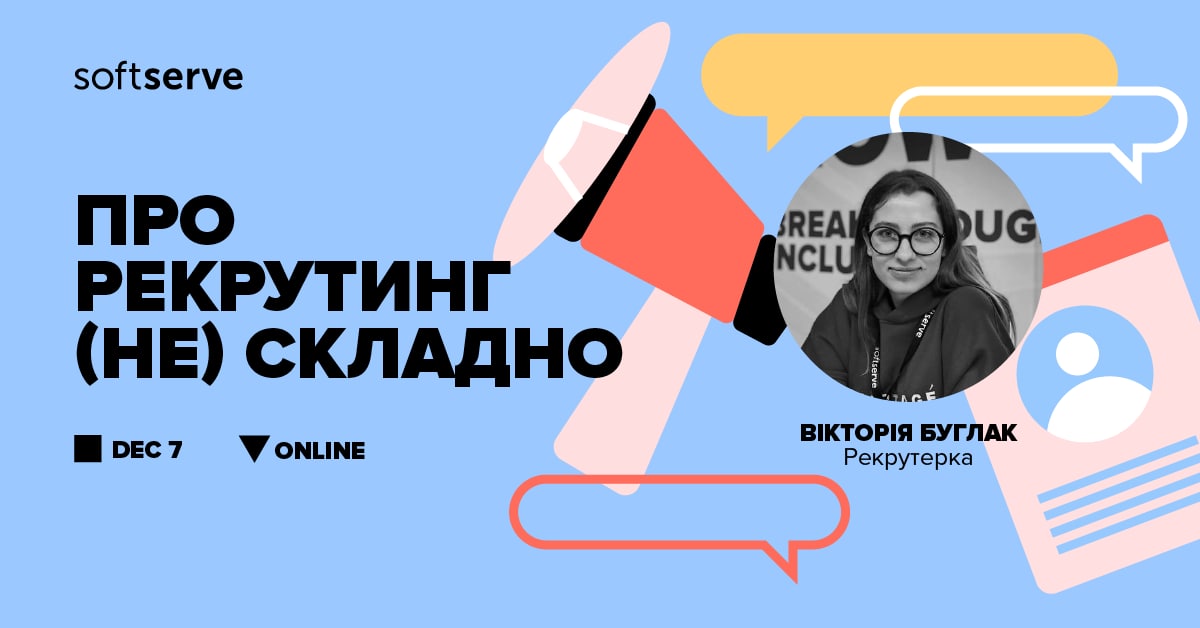 Поговоримо про рекрутинг (не) складно і цікаво?02 Грудня 2022р.![]() #можливості_перспектива Привіт! Поговоримо про рекрутинг (не) складно і цікаво? 7 грудня о 19:00 запрошуємо на вебінар Вікторії Буглак, Recruiter із SoftServe. Про що будемо говорити: Хто такий рекрутер і чому інколи вони крутіші за Агента 007? Як виглядає один день із життя рекрутера у SoftServe? Як з-поміж сотень релевантних кандидатів знайти супер-зірку? Як зростати і розвиватися у напрямку хайрингу? Приходь на нашу онлайн-подію і ми разом розглянемо ці й інші трендові теми, поділимось досвідом і знайдемо відповіді на цікаві запитання. Найактивнішим – приємний бонус: подарунки від SoftServe. Перед заходом ти отримаєш лист з підтвердженням про участь. Скоріше реєструйся - https://cutt.ly/r1SucRa і зустрінемось онлайн! |