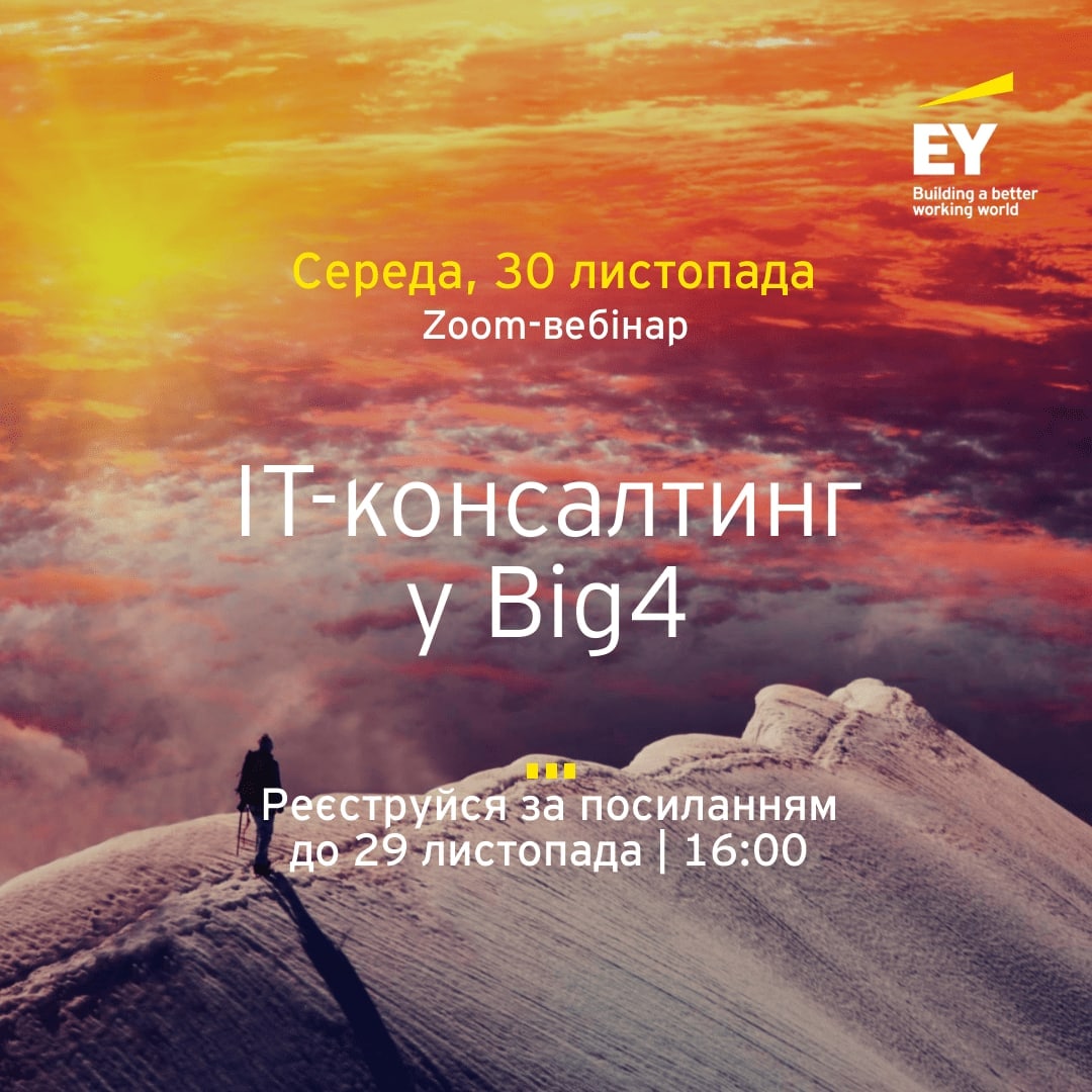 Приєднуйся до вебінару «IT-консалтинг у Big4»!15 Листопада 2022р.![]() #можливості_перспектива Відчуваєш, що твоє місце в ІТ, але не знаєш, з чого почати? Приваблює світ кібербезпеки, але бракує технічних знань? Приєднуйся до вебінару «IT-консалтинг у Big4»! Учасники дізнаються про специфіку роботу команди технологічних ризиків EY Ukraine, прослухають історії кар’єрного успіху від провідних фахівців напряму, а також отримають унікальну можливість – отримати job offer від компанії, розв’язавши практичний кейс. Для кого? Студентів та випускників технічних та економічних спеціальностей, які володіють англійською мовою на рівні С1-С2 та зацікавлені у роботі у сфері IT. Перевагою буде диплом закордонного ВНЗ або програми подвійного дипломування. 30 листопада 2022 16:00 (UTC+02) Zoom-конференція з Q&A сесією (лінк отримають тільки зареєстровані користувачі) Спікери: Дмитро Лазученков — керівник відділу технологічних ризиків EY Ukraine та провідні фахівці напряму — Олексій Урсол і Наталія Тусіна. Реєстрація за посиланням https://globaleysurvey.ey.com/jfe/form/SV_4Ocw0D4grpw3gmq |