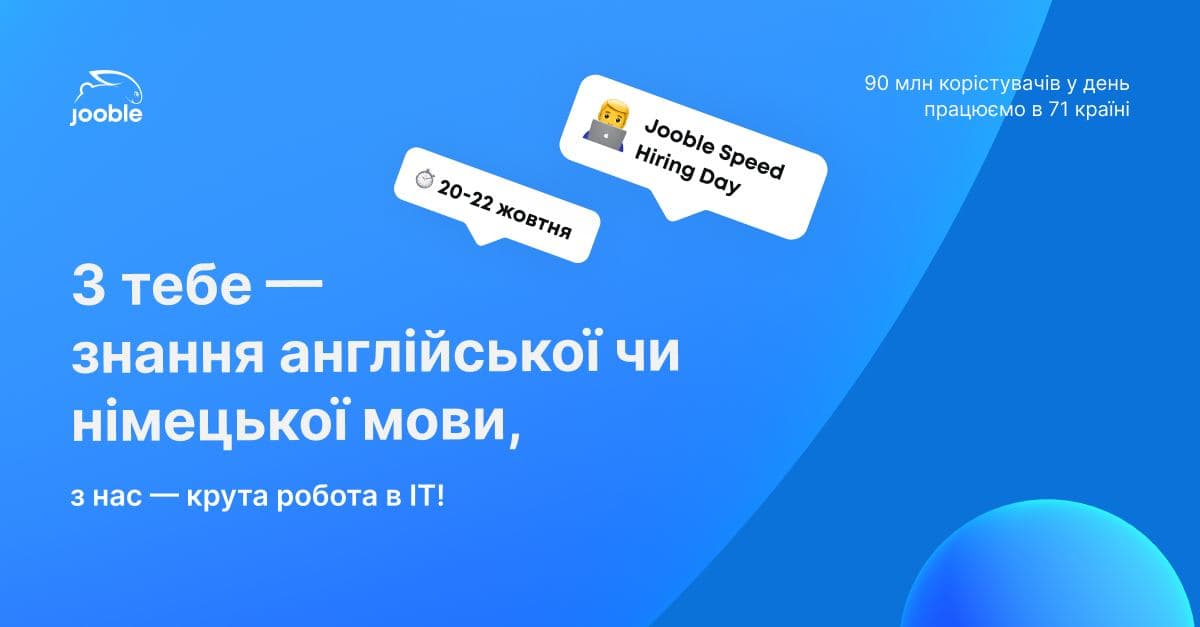 Jooble Hiring Week для лінгвістів06 Жовтня 2021р.![]() #можливості_перспектива Jooble Hiring Week для лінгвістів 20 - 22 жовтня Реєстрація до 17 жовтня. Для кого? Для тих, хто володіє англійською або німецькою мовою на вище середньому рівні та хоче щоденно її практикувати. Хоче будувати кар'єру в IT (або тільки мріє потрапити в цю сферу). Хоче розвиватися в діджітал-маркетингу та SEO-оптимізації. Що ми пропонуємо? Отримай оффер на позицію Partnership Manager за спрощеною системою відбору. Робота в українській продуктовії IT-компанії, що створює другий за кількістю аудиторії сайт в світі в сфері працевлаштування. Оплачуване навчання (досвід роботи не обов'язковий). Гнучкий графік, можливість працювати віддалено (або в офісі - на твій розсуд). Наші менеджери працюють на ринках 71 країни та розмовляють 25 мовами. Якщо ви хочете разом з нами створювати глобальний продукт, що допомогає людям знаходити роботу, заповнюй анкету та читай деталі: https://hiring.jooble.org/speed_hiring Якщо ти знаєш інші мови та хотів б працювати з нами: https://forms.gle/3ZCwXCkyyE5yMC3z9 |