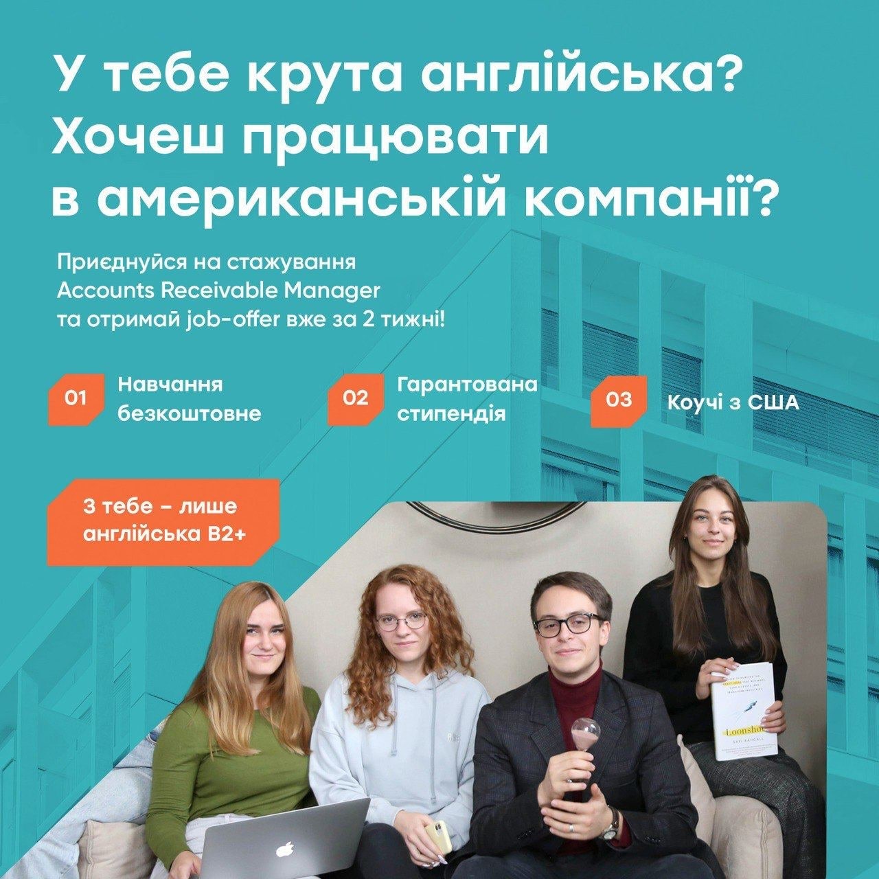 Отримайте 2 тижні практичного навчання і повне занурення у специфіку ринку США. Кращі кандидати отримають job-offer!