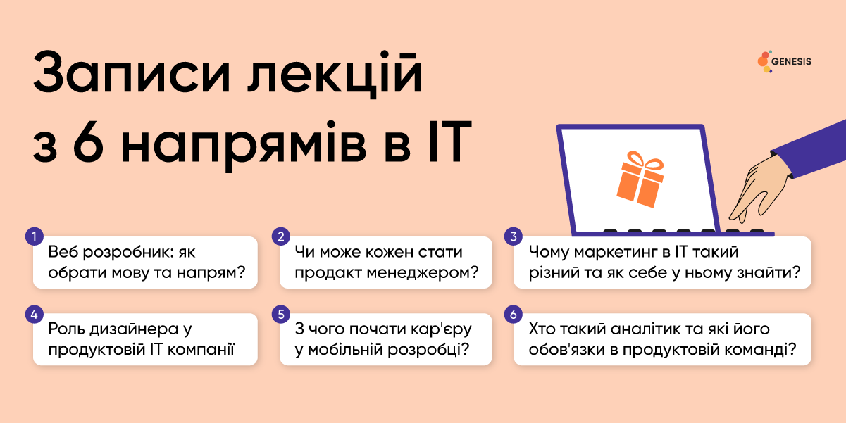 У подарунок — записи вебінарів, у яких експерти Genesis розповідають про soft і hard skills, можливості для розвитку та робочі інструменти у кожній із 6 сфер.