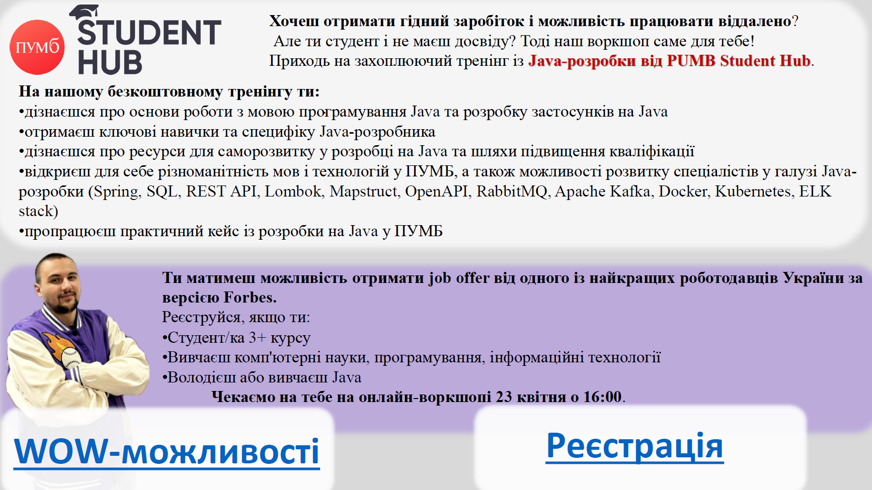 Тренінг із Java-розробки від PUMB Student Hub.22 Квітня 2024р.![]() (https://telegra.ph/file/9549c2504430278757c36.jpg)#можливості_перспектива Хочеш отримати гідний заробіток і можливість працювати віддалено?📍 Але ти студент і не маєш досвіду? Тоді наш воркшоп саме для тебе! Приходь на захоплюючий тренінг із Java-розробки від PUMB Student Hub. На нашому безкоштовному тренінгу ти: 💸дізнаєшся про основи роботи з мовою програмування Jаvа та розробку застосунків на Java; 💸отримаєш ключові навички та специфіку Јаvа-розробника; 💸дізнаєшся про ресурси для саморозвитку у розробці на Jаvа та шляхи підвищення кваліфікації; 💸відкриєш для себе різноманітність мов і технологій у ПУМБ, а також можливості розвитку спеціалістів у галузі Java розробки (Spring, SQL., REST API, Lombok, Mapstruct, OpenAPI, RabbitMQ, Apache Kafka, Docker, Kubernetes, ELK stack) 💸пропрацюєш практичний кейс із розробки на Jаvа у ПУМБ Ти матимеш можливість отримати job offer від одного із найкращих роботодавців України за версією Forbes. Якщо ти: 💸Студент/ка 3 курсу; 💸Вивчаєш комп'котерні науки, програмування, інформаційні технологій; 💸Володієш або вивчаєш Java. Реєструйся на онлайн-воркшопі 23 квітня о 16:00. |