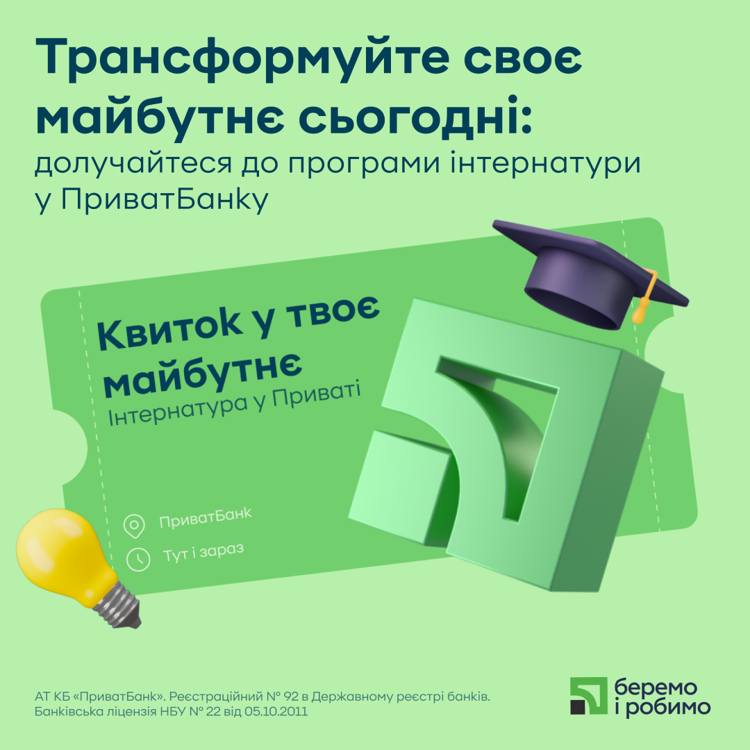 Інтернатура в ПриватБанку12 Квітня 2024р.![]() #можливості_перспектива Програма оплачуваної інтернатури в ПриватБанку Трансформація твого майбутнього: програма оплачуваної інтернатури в ПриватБанку.Ми запрошуємо амбітних студентів приєднатися до нашої програми на умовах тимчасового трудового договору. Це дозволить кожному учаснику програми: ● отримати корисний досвід; ● взяти участь у важливих проєктах, що формують майбутнє банківської індустрії; ● навчатися в найкращих професіоналів та створити фундамент своєї кар’єри; ● працювати за комфортним графіком. Напрямки, що готові запропонувати тимчасове працевлаштування студентам бакалаврату та магістратури у 2024 році: внутрішній аудит, інформаційні технології, середній та малий бізнес, керування ризиками. Тривалість: ● 3 місяці з 8-годинним робочим днем; ● 6 місяців з 4-годинним робочим днем. Старт програми: травень 2024 року. Формат роботи: ● офлайн та гібридний – у Києві та Дніпрі; ● онлайн – в інших населених пунктах. Наш кандидат: ● навчається в закладі вищої освіти; ● вмотивований розвиватися в банківській та фінансовій сфері; ● креативно мислить та має аналітичні здібності; ● вміє працювати в команді; ● володіє англійською мовою. Як подати заявку на приєднання до програми Надішли резюме та мотиваційний лист на адресу pbgraduates@privatbank.ua до 3 травня 2024 року. У мотиваційному листі зазнач: ● чому ти прагнеш приєднатися до нашої програми; ● які напрямки з перерахованих вище тебе цікавлять найбільше й чому; ● який графік тебе влаштовує (3 місяці з 8-годинним робочим днем або 6 місяців – із 4-годинним); ● чи маєш можливість працювати в офісі або в гібридному форматі (актуально для Києва та Дніпра), чи тільки в онлайн-форматі (зазнач всі варіанти, які ти розглядаєш). Ми та твоя кар’єра в найбільшому банку країни чекаємо на тебе! |