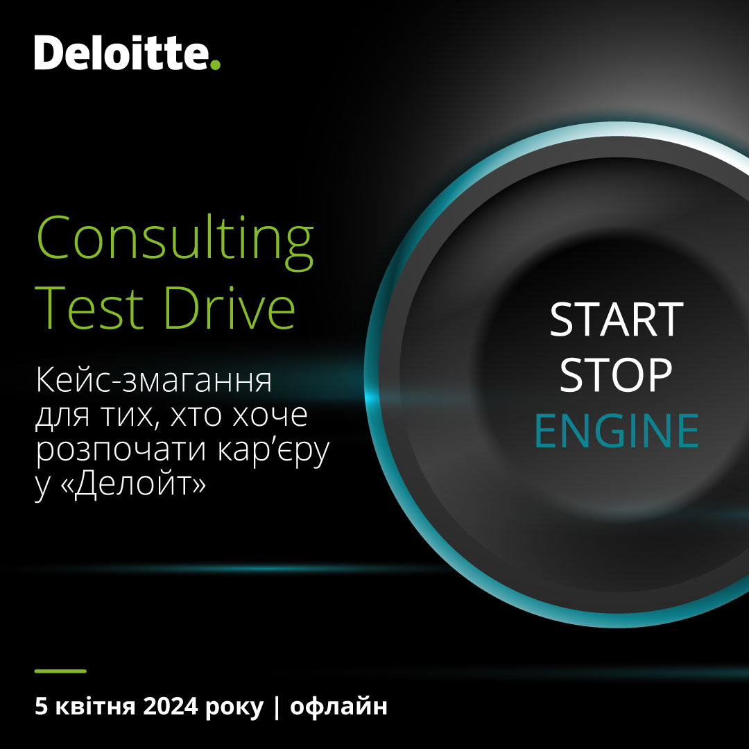 Consulting Test Drive – це кейс-змагання, під час якого учасники матимуть змогу поспілкуватись з експертами напрямів консалтингу та управління ризиками, здобути досвід розв’язання практичного кейсу, приміряти на себе роль консультанта(-ки), а також стати частиною команди «Делойт».