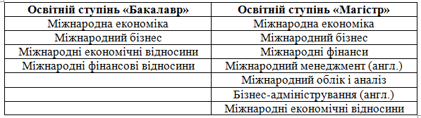 ВступникамПерелік освітніх програм, за якими здійснюватиметься підготовка на факультеті міжнародної економіки і менеджменту з 2025/2026 н.р.: Перелік конкурсних предметів національного мультипредметного тесту 2022 року та вагових коефіцієнтів для вступу на навчання для здобуття освітнього ступеня бакалавра на основі повної загальної середньої освіти на освітні програми факультету міжнародної економіки і менеджменту Спеціальність | Освітня програма | Конкурсні предмети національного мультипредметного тесту (НМТ) | Ваговий коефіцієнт | Мінімальна кількість балів | Мотиваційний лист | 051 Економіка | Міжнародна економіка | 1.Українська мова | 0,35 | 100,0 | + | 2. Математика | 0,4 | 100,0 | 3. Історія України | 0,25 | 100,0 | 292 Міжнародні економічні відносини | Міжнародні економічні відносини | 1.Українська мова | 0,3 | 100,0 | + | 2. Математика | 0,4 | 100,0 | 3. Історія України | 0,3 | 100,0 | 292 Міжнародні економічні відносини | Міжнародні фінансові відносини | 1.Українська мова | 0,3 | 100,0 | + | 2. Математика | 0,4 | 100,0 | 3. Історія України | 0,3 | 100,0 | 076 Підприємництво, торгівля та біржова діяльність | Міжнародний бізнес | 1.Українська мова | 0,35 | 100,0 | + | 2. Математика | 0,4 | 100,0 | 3. Історія України | 0,25 | 100,0 |