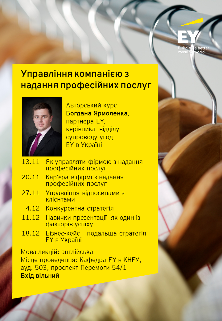 Компанія EY та Інститут вищої освіти КНЕУ запрошують студентів, аспірантів та викладачів прослухати безкоштовний курс лекцій “Управління фірмою з надання професійних послуг” від Богдана Ярмоленка, партнера EY, керівника відділу супроводу угод EY в Україні.