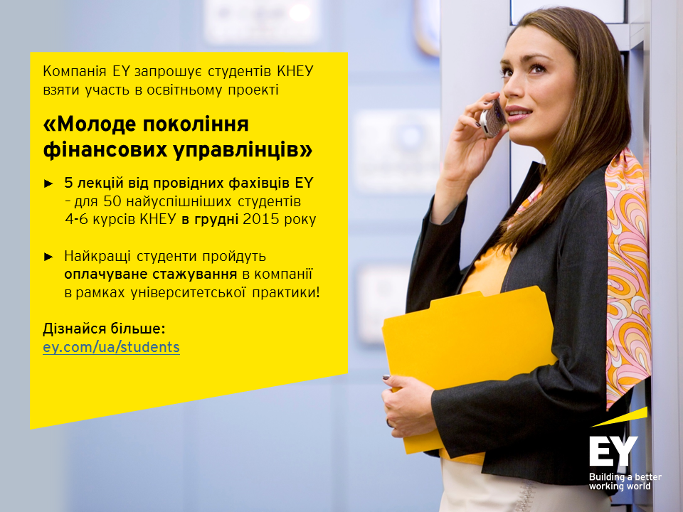 Спеціальний освітній проект “Молоде покоління фінансових управлінців” для студентів КНЕУ від компанії EY26 Листопада 2015р.![]() РЕЄСТРАЦІЯ ЗАКІНЧУЄТЬСЯ 26 ЛИСТОПАДА 2015 Четвертий рік поспіль компанія EY запрошує студентів 4-6 курсів Київського національного університету імені Вадима Гетьмана взяти участь у навчальному проекті “Молоде покоління фінансових управлінців”. На Вас чекають: