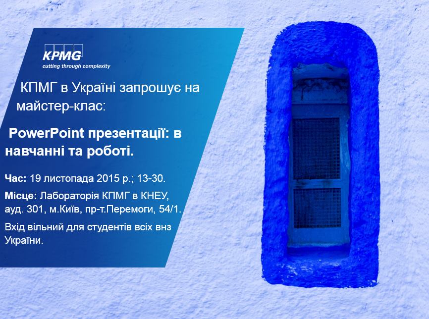 Запрошуємо студентів на майстер-клас Альони Янішевської, спеціаліста з розвитку та навчання Відділу по роботі з персоналом КПМГ в Україні: "PowerPoint презентації: в навчанні, в роботі, в житті".