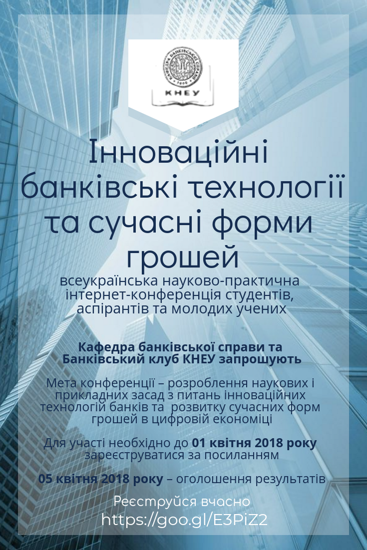 - Всеукраїнська науково-практична інтернет-конференція студентів аспірантів і молодих учених «ІННОВАЦІЙНІ БАНКІВСЬКІ ТЕХНОЛОГІЇ ТА СУЧАСНІ ФОРМИ ГРОШЕЙ» 5 квітня