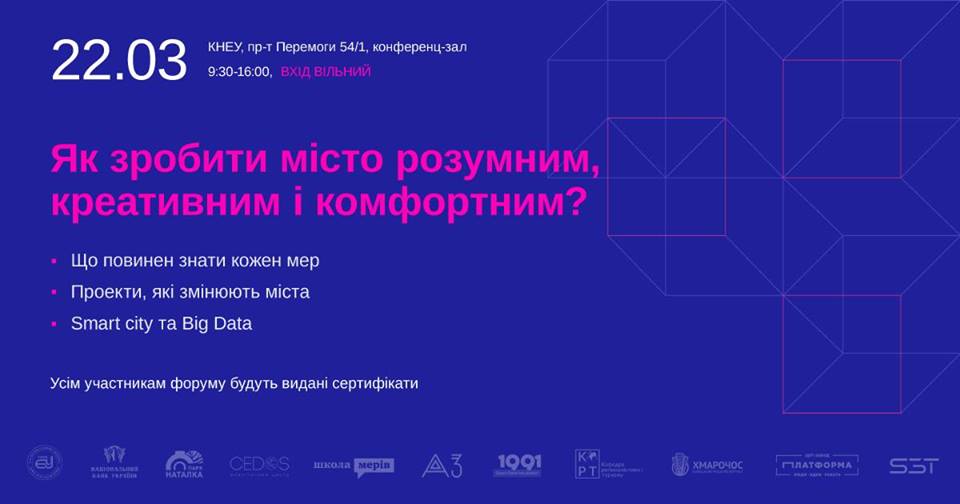 Урбаністичний форум “Як зробити місто розумним, креативним і комфортним?“ (22 березня 2018 року)22 Березня 2018р.![]() 22 березня2018 року у ДВНЗ «Київський національний економічний університет імені Вадима Гетьмана» відбудеться Урбаністичний форум “Як зробити місто розумним, креативним і комфортним?“. Метою форуму є обмін досвідом, поширення знань про сучасні успішні урбаністичні проекти, а також обговорення інструментів управління міськими громадами та можливості реалізації потенціалу молоді для розвитку міст. Вхід вільний за умови попередньої реєстрації. Тематичні напрями форуму охоплюватимуть проблематику управління міським розвитком, впливу сучасних технологій на функціонування міст, залучення креативного класу до реалізації проектів, які змінюють міста на краще. Під час урбаністичного форуму відбуватимуться обговорення в рамках трьох панельних дискусій: