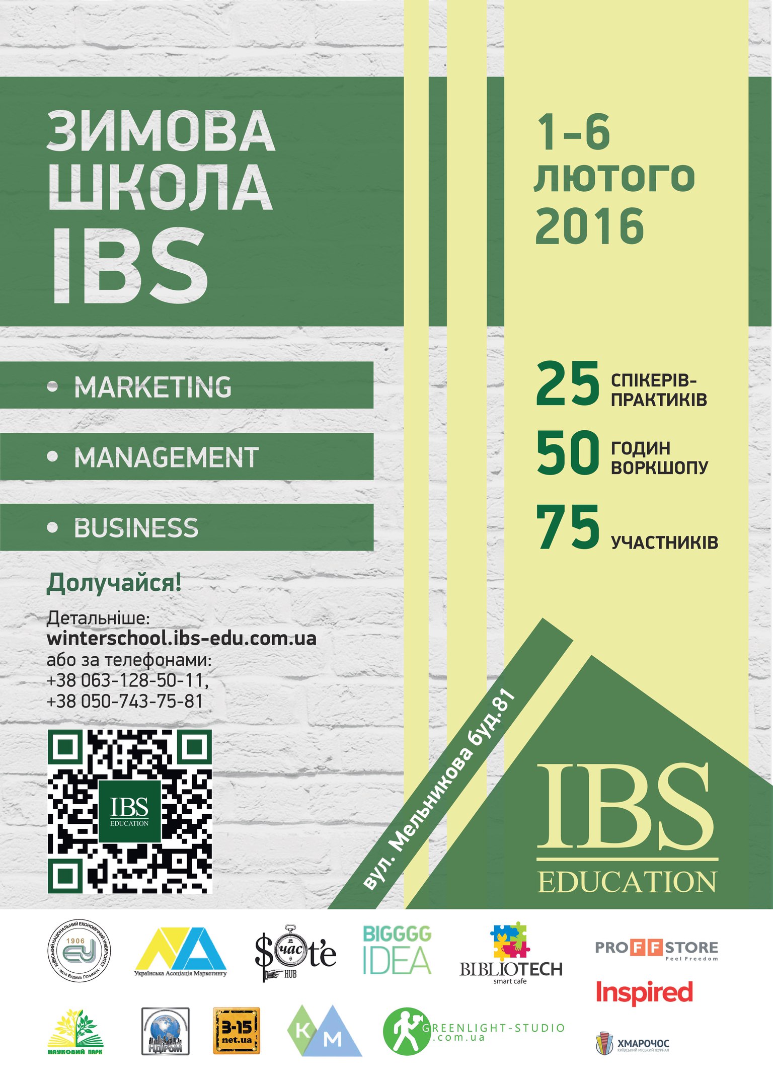 Зимова Школа IBS01 Лютого 2016р.![]() Зимова Школа IBS – це масштабний проект для студентів, випускників, бізнесменів та всіх тих, хто шукає шляхи реалізацій та вдосконалення своїх бізнес – ідей. А допоможуть визначити нішу для власного бізнесу, правильно провести маркетингові дослідження та будувати стратегію розвитку власної справи - кращі бізнес – тренери та практики. Серед запрошених спікерів, представлені Олександр Кардаков – голова наглядової ради «Октава Капітал», засновник Інком; Руслан Крамаренко – заступник голови КМДА (2010 – 2014); Дмитро Мужук – засновник smartcafeBibliotech, а також топ-менеждери провідник компаній, таких як: MondelezУкраїна, E&Y, Louis-Dreyfus, Colin’s, Hashtag, Proffstore, BiggggIdea, Хмарочос, TEDxKNEU, 3SAgency, WEBFace, ATMASFERA360, ZenithOptimedia, GroupDF, Молочний Альянс, Колоріс та багато інших. Алене треба запитувати, що я отримаю від Зимової Школи IBS, доречніше запитати: «Як я зможу реалізувати самостійно отриманні корисні поради та навички від людей, які показали, що це реально працює на практиці?» Зимова Школа IBSпропонує 3 напрямки навчання на вибір: Школа Маркетингу, Школа Бізнесу та Школа Менеджменту. Обравши один з трьох, ви на цілий тиждень зануритесь у світ запропонованої програми разом з учасниками з усієї України, серед яких можуть виявитися ваші потенційні партнери, колеги, друзі. Зимова Школа IBS– це поєднання корисної, ексклюзивної інформації у поєднанні з практичними заняттями, виступами спікерів з провідних українських компаній та незабутньою розважальною програмою, що відповідатиме тематиці зимових свят. А разом усе це – незабутній час у Зимовій Школі IBS! Квитки на захід уже в продажі! Детальна інформація за посиланням: http://winterschool.ibs-edu.com.ua, а також слідкуйте за акціями та святковими знижками у соц.. мережах: http://vk.com/ibs_edu https://www.facebook.com/IBSEducationUA/ https://www.instagram.com/ibs_education/ Коли: 1-6 лютого 2016 р. Де: м. Київ, вул.Мельникова, 81 Контакти: 063 128 50 11 Олександр 050 743 75 81 Анна 093 073 11 20 Ольга Стань частиною масштабного проекту!