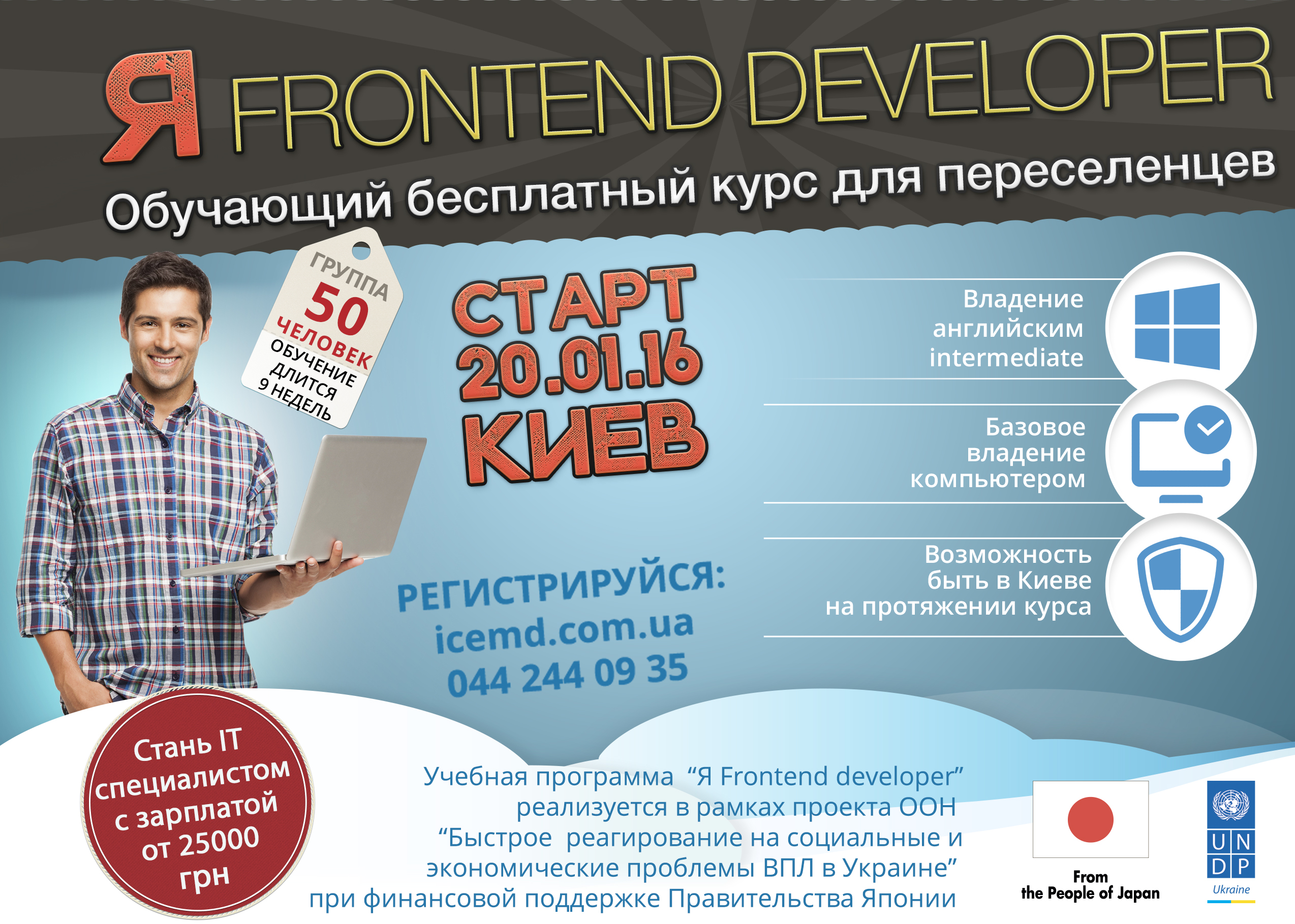 за фінансової підтримки Уряду Японії, оголошує набір 50 -ти чоловік в групи безкоштовного навчання за спеціальністю Frontend - developer . Якщо тобі цікава робота в IT , є реєстрація ВПО , середнє знання англійської , і ти проживаєш у Києві, - це твій шанс! Реєструйся на відбір вже сьогодні та 20 січня приходь на заняття.