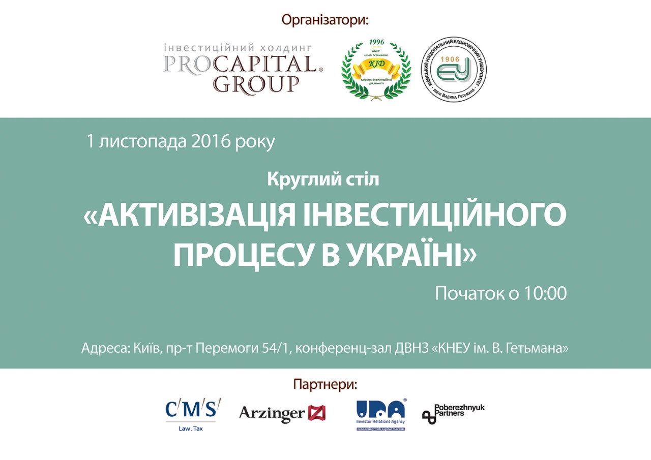 Круглий стіл "Активізація інвестиційного процесу в Україні"01 Листопада 2016р.![]() 1 листопада о 10:00 у конференц-залі ДВНЗ «Київський національний економічний університет ім. М. Гетьмана» відбудеться круглий стіл «Активізація інвестиційного процесу в Україні», організований інвестиційним холдингом Pro Capital Group та кафедрою інвестиційної діяльності фінансово-економічного факультету КНЕУ ім. В. Гетьмана. Програма круглого столу наступна: Сесія 1.«Інвестиційний клімат України. Шлях до інвестора» Спікери та теми доповідей: - Владислав Зимовець «Інвестиційний процес в Україні: під тиском макрофінансових дисбалансів та слабкої інституційної основи». Владислав Зимовець - доктор економічних наук, старший науковий співробітник, завідувач відділу фінансів реального сектору Державної установи «Інститут економіки та прогнозування НАН України». Автор багатьох наукових публікацій у сфері фінансового та економічного розвитку. - Тетяна Майорова «Трансформація інвестиційного процесу в умовах глобальних викликів». Тетяна Майорова - доктор економічних наук, професор, «Відмінник освіти України». Завідувач кафедри інвестиційної діяльності ДВНЗ «Київський національний економічний університет імені Вадима Гетьмана». Експерт Центру підтримки реформ. Автор понад 140 наукових та методичних публікацій з проблем фінансово-кредитного забезпечення інвестиційної діяльності суб'єктів господарювання. - Світлана Онишко «Інституційне забезпечення підвищення гнучкості державної фінансової політики у формуванні інвестиційного клімату в Україні». Світлана Онишко - доктор економічних наук, професор, завідувач кафедри фінансових ринків Університету державної фіскальної служби України. Автор понад 150 наукових та методичних публікацій із проблем фінансового забезпечення інвестиційно-інноваційного розвитку країни. Основні напрямки наукових досліджень: можливості та резерви фінансового сектору у здійсненні структурної модернізації, оцінка дії і перспектив бюджетно-податкових важелів структурної перебудови національної економіки, правові засоби структурної модернізації. - Анатолій Дробязко «Шляхи впровадження стратегії розвитку банківської системи, як провайдера поліпшення інвестиційного клімату в Україні». Анатолій Дробязко - відомий експерт в сфері фінансів і банківської справи, кандидат економічних наук, провідний науковий співробітник ДННУ «Академія фінансового управління», має багаторічний досвід роботи у фінансовій системі, автор більше 50 наукових робіт, у тому числі й у міжнародних економічних виданнях. Головний редактор та видавець економічного часопису «Фінансові ризики» в період з 1993 по 2009 рр. З 2014 року залучений до діяльності Тимчасової комісії з питань реформування банківської системи Громадської ради при Національному банку України. Сесія 2.«Чи захищений іноземний інвестор в Україні. Правові аспекти». Спікери та теми доповідей: - Маркіян Мальський «Аспекти міжнародної практики захисту прав інвесторів». Маркіян Мальський, адвокат, кандидат юридичних наук, партнер, голова Західноукраїнської філії Arzinger, керівник практик арбітражу, вирішення спорів та сільського господарства. Спеціалізується на наданні юридичної підтримки в інвестиційних проектах (нерухомість, комерційні, корпоративні справи), а також представництві 