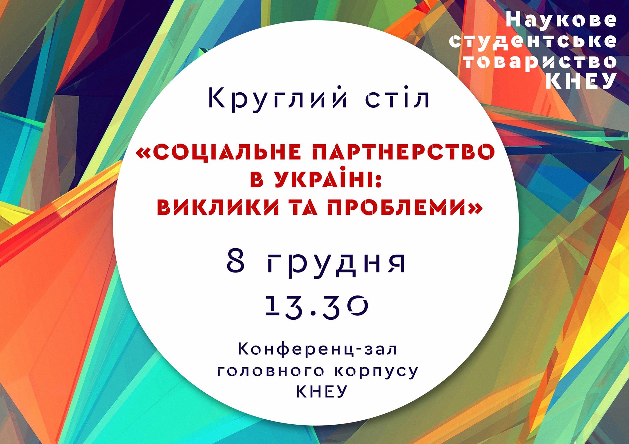8 грудня о 13.30 в конференц-залі головного корпусу КНЕУ за ініціативи Наукового студентського товариства відбудеться круглий стіл «Соціальне партнерство в Україні: виклики та проблеми»07 Грудня 2015р.![]() Мета: на прикладі моделей взаємодії бізнесу та соціуму виявити сучасні соціальні потреби та можливості їх задоволення, дати студентам поштовх майбутнього кар’єрного розвитку на засадах соціальної відповідальності. Питання до обговорення: соціальне партнерство, соціальний підприємець, соціальне підприємство, соціальна відповідальність бізнесу
