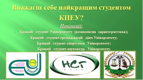 Конкурс «Кращий студент КНЕУ» - програма, яка щорічно проводиться з метою виявлення найкращих і найталановитіших студентів Університету та є відбірковою до Всеукраїнського змагання! Участь можуть брати студенти 2-5 курсів денної форми навчання в кількох номінаціях. Переможці отримають цінні призи та можливість позмагатися в званні Кращий студент Києва та України! Заявки приймаються лише до 10 листопада! У рамках конкурсу «Кращий студент КНЕУ» визначаються такі номінації: