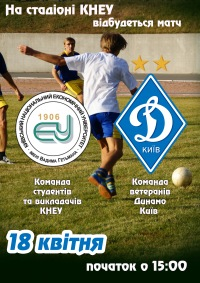 На футбольному полі «КНЕУ імені Вадима Гетьмана» зіграють команди студентів (яка стала переможцем Всеукраїнського конкурсу «Студбатл» на краще відео) і викладачів КНЕУ та команда ветеранів "Динамо" (гравці 90-х років). Ти маєш нагоду побачити кумирів свого дитинства прямо у себе в університеті.