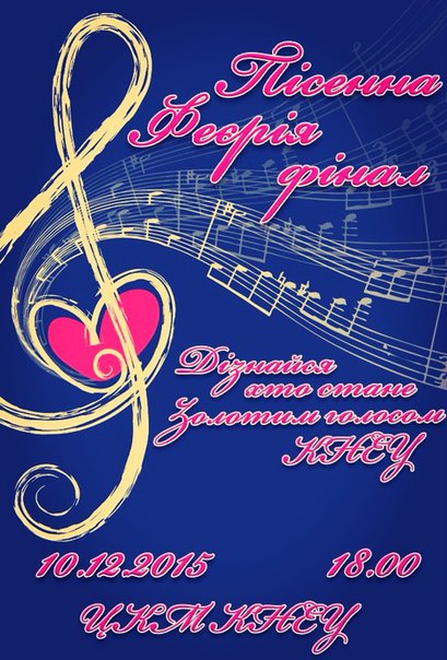 Півфінал "Пісенної Феєрії" подарував незабутні емоції від кожної виконаної пісні та вразив справжньою феєрією талантів! Приходьте 10.02.15 о 18.00 в ЦКМ КНЕУ на фінал фестивалю-конкурсу "Пісенна Феєрія" та дізнайтеся хто з наших фіналістів отримає почесне звання "Золотий голос КНЕУ 2015"! Буде гаряче!
