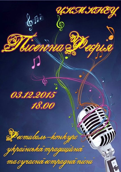 Четвер (3.12) о 18.00 в ЦКМ КНЕУ Фестиваль-конкурс української традиційної та сучасної естрадної пісні Пісенна Феєрія03 Грудня 2015р.