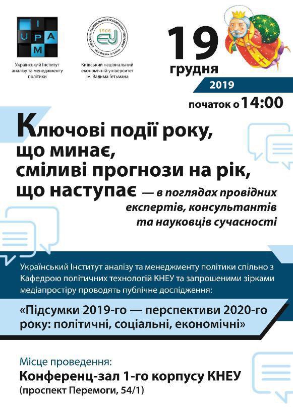 19 грудня 2019 р. о 14:00 в конференц-залі 1-го корпусу (проспект Перемоги, 54/1) відбудеться круглий стіл на тему: «Підсумки 2019-го – перспективи 2020-го року: політичні, соціальні, економічні» на якому будуть представленні багатогранні погляди експертів, консультантів та науковців на ключові події року що минає, та зроблені прогнози на рік, що наступає.