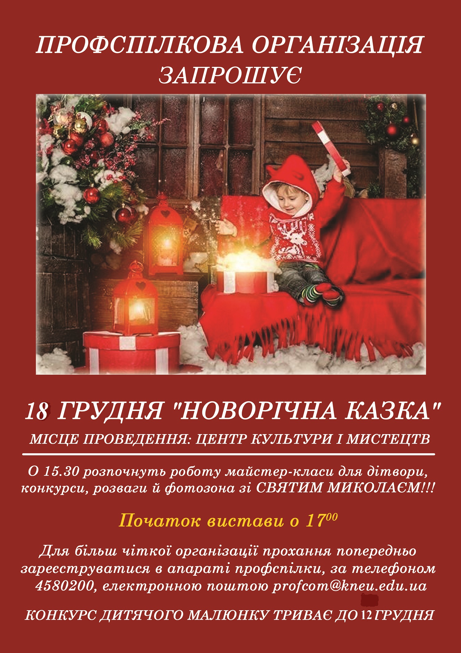 Шановні колеги, профспілка запрошує Вас 18 грудня до Центру культури та мистецтв на новорічні виставу. О 15.30 розпочнуть свою роботу майстер-класи, відбуватимуться конкурси та розваги. Початок вистави о 17.00. Чекаємо на Вас з дітьми та онуками.