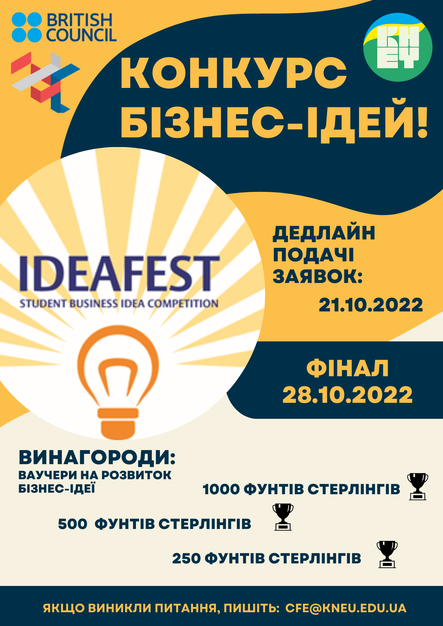 Конкурс дає можливість студентам та аспірантам КНЕУ представити свої бізнес-ідеї та отримати необхідну підтримку в їх комерціалізації. Ніякі попередні знання про підприємництво не вимагаються, потрібно лише мати свою ідею та бажання її реалізувати! Переможець IDEAFEST отримає ваучер на розвиток/тестування своєї бізнес ідеї на суму 1000 фунтів стерлінгів, переможці 2 та 3 місця отримають ваучери на розвиток ідеї на суму 500 та 250 фунтів стерлінгів, а також наставництво міжнародних бізнес-експертів та очікуються інші цікаві призи та корисні можливості. Подати заявку можна до 21 жовтня 2022р. включно на електронну пошту cfe@kneu.edu.ua, заповнивши форму для участі та представивши коротке (максимум 2 хвилини) англомовне відео про Вашу ідею. Всі заявки конкурсантів будуть оцінені міжнародними експертами. Cеред усіх отриманих заявок буде обрано 5 фіналістів для представлення бізнес ідей 28 жовтня 2022 року. На цьому заході будуть присутні студенти, викладачі та зовнішні експерти, а переможця буде обрано та оголошено міжнародними суддями. Після цього відбудеться церемонія вручення призів. Винагороди