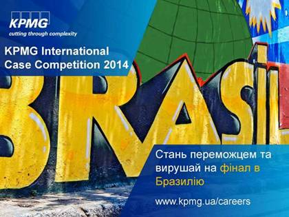 KICC 2014 | Сан-Паулу, Бразилія Скористатися шансом. Кинути виклик собі. Розширити горизонти. Готові спробувати себе в якості професійного консультанта КПМГ? Тоді KPMG International Case Competition (KICC) саме для вас! Станьте найкращою командою київського етапу відбору, а потім півфіналу СНД – і вирушайте на міжнародний фінал до Бразилії! Кожного дня професіонали КПМГ успішно вирішують надзвичайно складні задачі, які ставить перед ними сучасний бізнес. Вашій команді буде запропоновано за 3 години знайти рішення однієї з таких задач. Випробуйте себе! Розпочніть пригоду, яку ви не забудете ніколи! Зважились? Тоді поспішайте подати заявку на київський етап відбору, що відбудеться 20 лютого! Крок 1 Реєструйтеся в KPMG Recruitment System до 5 лютого 2014 р. Крок 2 Учасникам, які пройдуть попередній відбір, буде надіслано письмове завдання. Вирішуйте завдання та надсилайте свою відповідь до 13 лютого 2014 р. Крок 3 Команди, які успішно пройдуть відбір, отримають шанс знайти рішення бізнес-кейсу і презентувати його журі в київському офісі КПМГ (20 лютого 2014). Команди-переможниці регіональних етапів будуть боротися за титул чемпіона СНД в офісі КПМГ у Москві (5 березня 2014 р.). Переможець фіналу СНД буде захищати честь України на міжнародному фіналі у Сан-Паулу, змагаючись з командами з 25 країн (1-4 квітня 2014 р.). Витрати на проживання і харчування, а також дорожні витрати учасників фіналу СНД у Москві та міжнародного фіналу у Сан-Паулу сплачуються КПМГ. Детальніше про конкурс та вимоги до учасників можна дізнатися на сайті КПМГ.