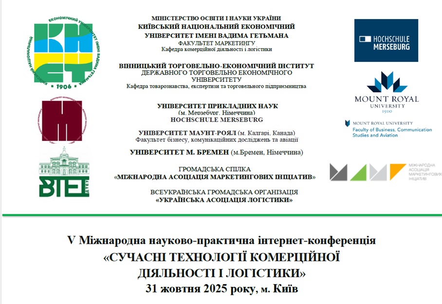 Запрошуємо взяти участь: V Міжнародна науково-практична інтернет-конференція «СУЧАСНІ ТЕХНОЛОГІЇ КОМЕРЦІЙНОЇ ДІЯЛЬНОСТІ І ЛОГІСТИКИ»30 Жовтня 2025р.![]() До участі в конференції запрошуються представники наукової та освітянської спільнот, державних установ, громадських організацій, професійних об’єднань та компаній різних ринків. Конференція відбудеться у формі відеоконференції 31 жовтня 2025р. Участь у конференції – безкоштовна. Мета конференції: об’єднати дослідників та спеціалістів для окреслення напрямів розвитку сучасних технологій комерційної діяльності і логістики в Україні та світі під впливом глобальних викликів (війна, пандемія) і регіональних особливостей діяльності компаній. Завдання конференції: · визначити ключові тренди розвитку комерційної діяльності та логістики в Україні та світі з врахуванням сучасних викликів; · забезпечити міжнародний обмін досвідом організації логістичних процесів на рівні підприємств в кризових умовах; · сформувати підхід до здійснення комерційних операцій у глобальному інформаційно-комунікаційному середовищі; · оцінити перспективи використання сучасних інформаційних рішень для оптимізації комерційних та логістичних процесів. Робота конференції планується за такими тематичними напрямами: СЕКЦІЯ 1. ПІДХОДИ ТА ІНСТРУМЕНТАРІЙ ЗАБЕЗПЕЧЕННЯ ЕФЕКТИВНОСТІ КОМЕРЦІЙНОЇ ДІЯЛЬНОСТІ Й ОРГАНІЗАЦІЇ ТОРГІВЕЛЬНИХ ОПЕРАЦІЙ 1. Глобальна комерційна діяльність та входження національних операторів на ринки ЄС. 2. IT тренди (діджиталізація) в комерційній діяльності компаній. 3. Розвиток форматів комерційної діяльності за сучасних умов. СЕКЦІЯ 2. ЛОГІСТИЧНИЙ МЕНЕДЖМЕНТ В РОЗВИТКУ СУЧАСНИХ КОМПАНІЙ ТА ЇХ ОБ’ЄДНАНЬ 1. Інтегровані ланцюги постачання як складова безпеки національного та регіонального рівнів. 2. Забезпечення стійкості транспортно-логістичних компаній України. 3. Державне регулювання та підтримка логістичних і комерційних компаній України. СЕКЦІЯ 3. БІЗНЕС-МОДЕЛІ СУЧАСНОГО ПІДПРИЄМНИЦТВА 1. Розвиток підприємництва в період воєнного стану. 2. Ризик-менеджмент і забезпечення сталого розвитку підприємств. 3. Маркетингове забезпечення ефективного розвитку національних виробників. Робочі мови конференції: українська, англійська. Для участі у конференції до 23 жовтня 2025 року необхідно: · Заповнити он-лайн заявку на участь у конференції та прикріпити в форму тези доповідей:https://forms.gle/eVf3BTvJEofBVqbQ6 · Продублювати на скриньку logistics.kneu@gmail.com тези доповіді (із обов’язковим зазначенням в темі листа: «Конференція_2025_Прізвище»). |