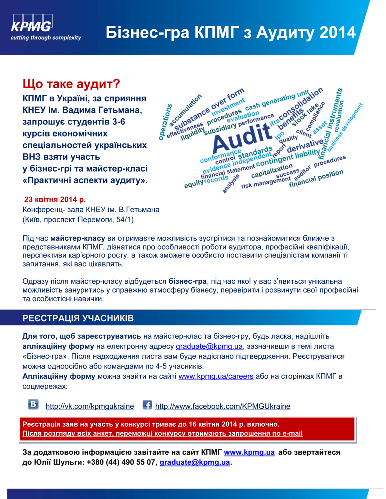 - КПМГ в Україні запрошує студентів старших курсів економічних спеціальностей взяти участь у бізнес-грі та майстер-класі «Практичні аспекти аудиту»