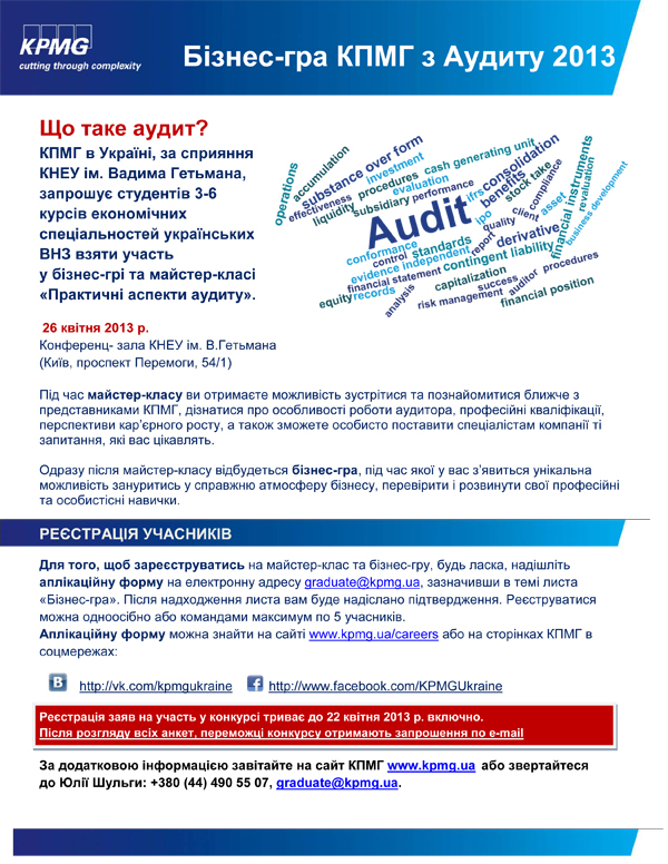 Бізнес-гра КПМГ з Аудиту 201326 Квітня 2013р.КПМГ в Україні, за сприяння КНЕУ ім. Вадима Гетьмана, запрошує студентів 3-6 курсів економічних спеціальностей українських ВНЗ взяти участь у бізнес-грі та майстер-класі«Практичні аспекти аудиту».