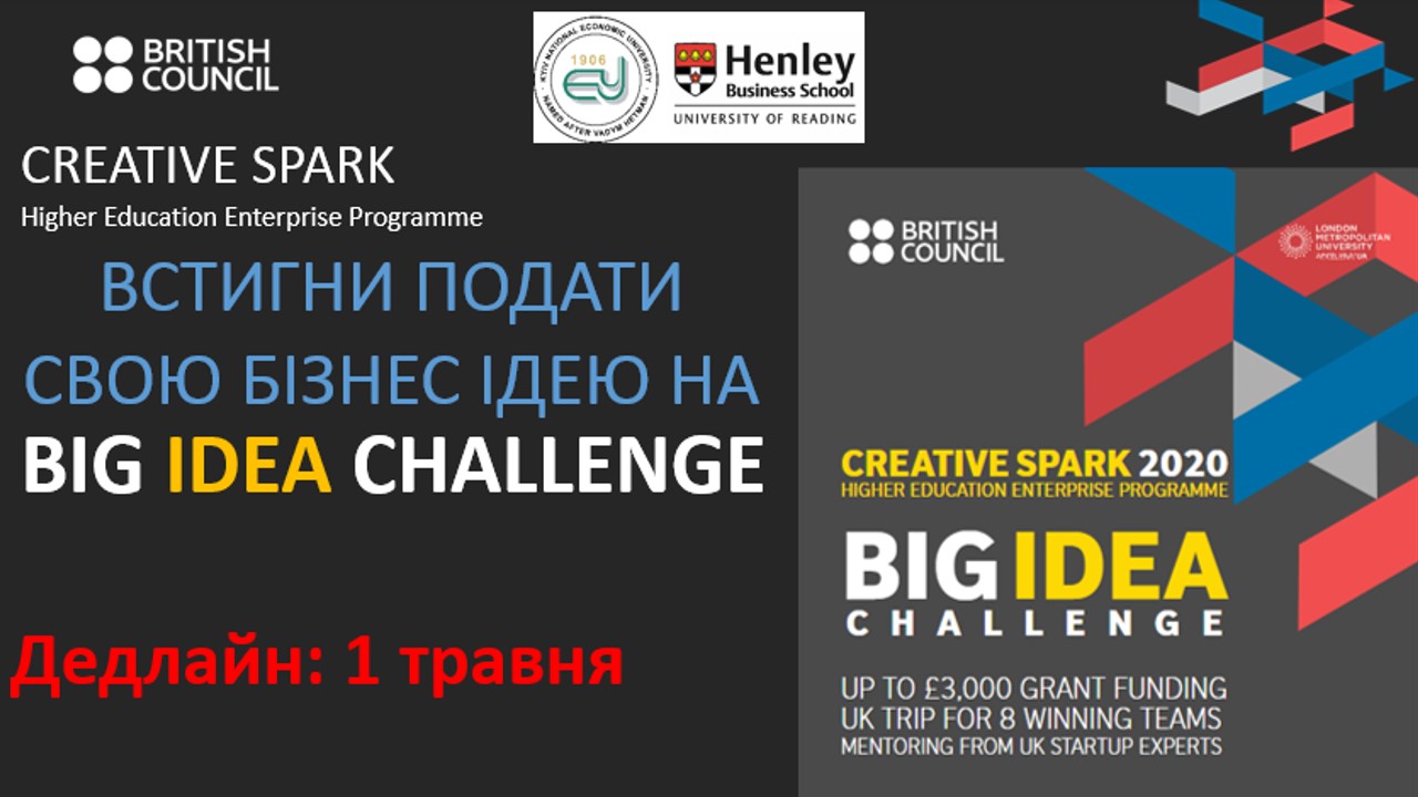 Creative Spark Big Idea Challenge!15 Травня 2020р.![]() У вас є дивовижна ідея і ви мрієте одного дня створити власну компанію? Будь то бізнес, соціальний, творчий проект, чи щось інше, ми хочемо знати про це! Виграйте до 3 000 фунтів стерлінгів та інші призи, включаючи поїздку до Лондона! Сьогодні стартує прийом заявок на міжнародний конкурс відео пітчів CreativeSparkBig Idea Challenge! Якщо ви студент, випускник чи підприємець-початківець з Київського національного економічного університету імені Вадима Гетьмана, ви можете подати заявку та отримати шанс виграти до 3000 фунтів стерлінгів на реалізацію власної ідеї, включаючи поїздку до Лондона! Ви можете подати проект в одну з наступних категорій: