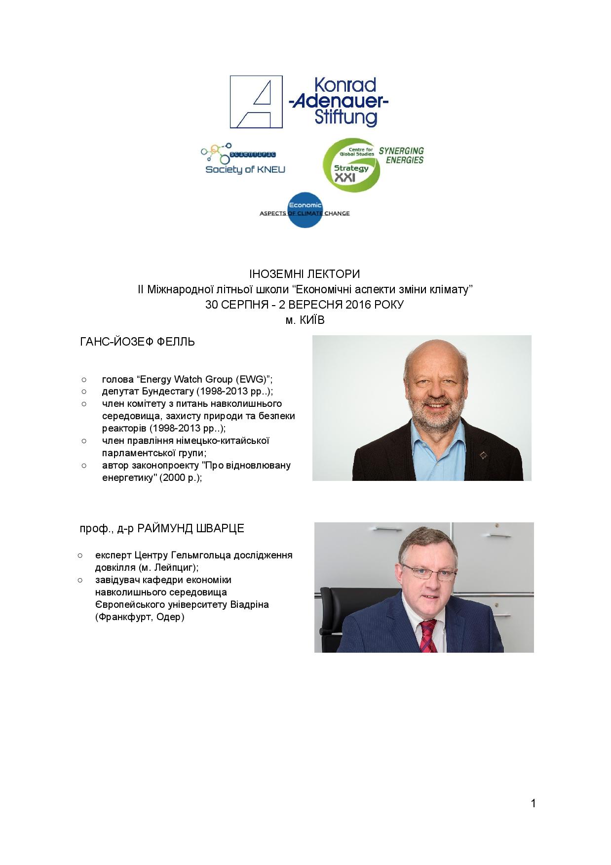 В якості лекторів запрошено вітчизнаняних та іноземних експертів у сфері кліматичних фінансів. Протягом чотирої днів учасники школи матимуть можливість ознайомитись із сучасним інструментарієм протидії зміні клімату та акумуляції фінансових ресурсів, необхідних для протидії глобальному потеплінню.
