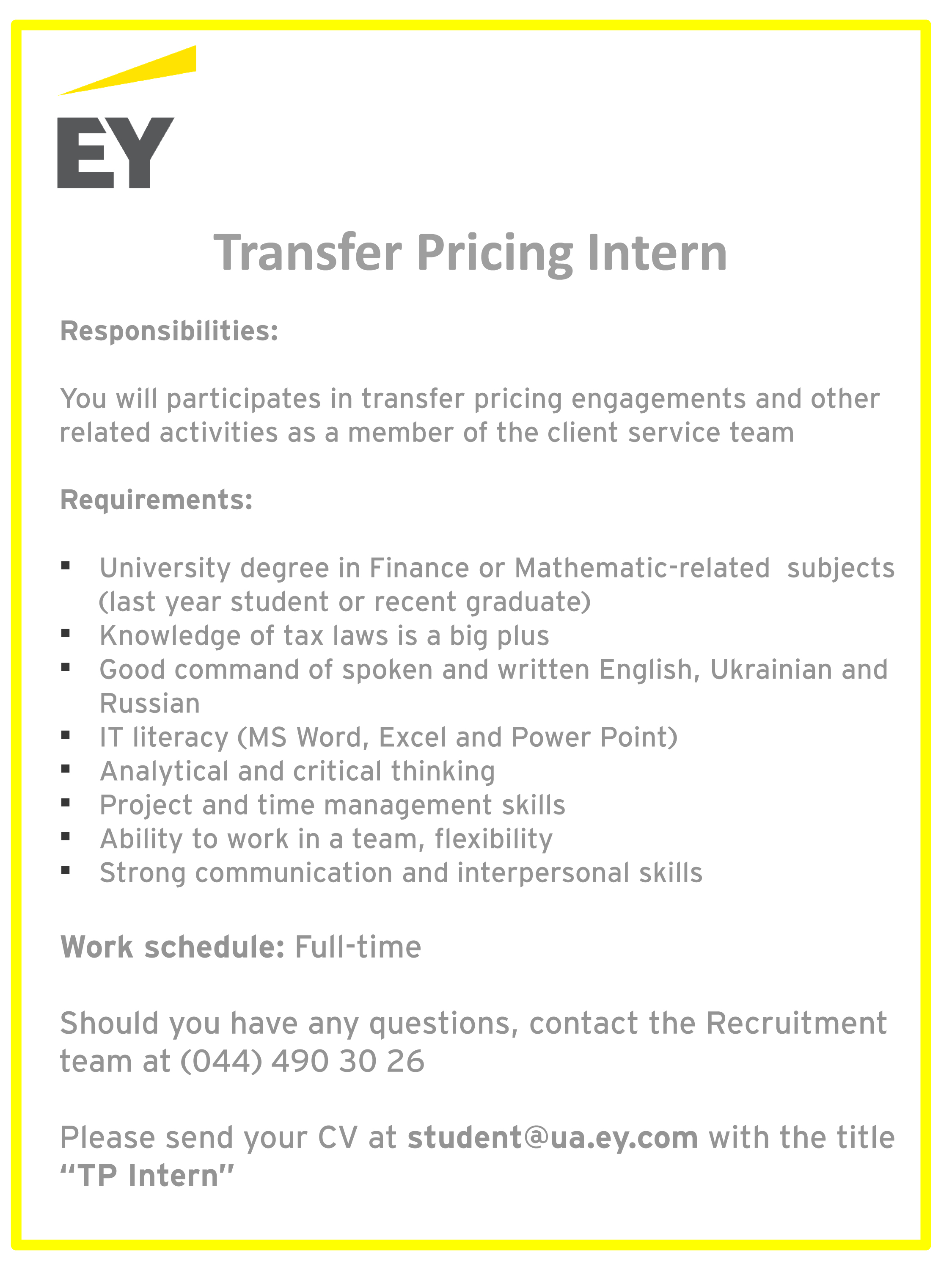 Please send your CV at student@ua.ey.com with the title “TP Intern”