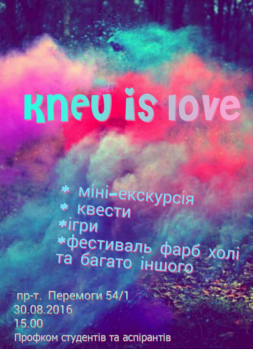 Запрошуємо усіх першокурсників, студентів II-VI курсів на феєричне свято під гаслом: "KNEU is love" 30.08.2016 о 15:30, зустріч біля першого корпусу КНЕУ (пр-т. Перемоги, 54/1). Фестиваль проводитиметься на стадіоні "Економіст" ДВНЗ КНЕУ імені Вадима Гетьмана.