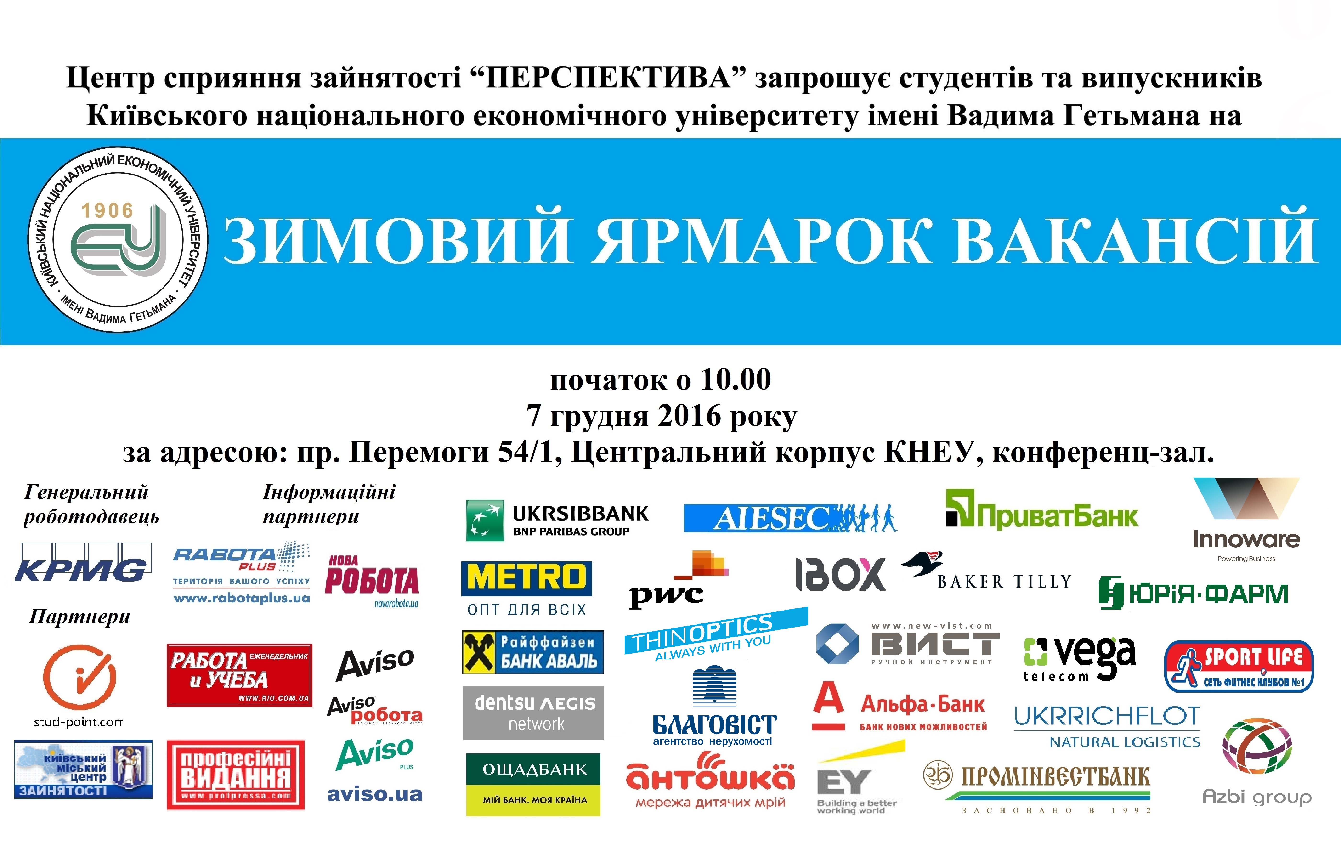 - 7 грудня 2016 року Центр "Перспектива" запрошує студентів та випускників КНЕУ ім. В.Гетьмана на квест «Зимовий ярмарок вакансій»