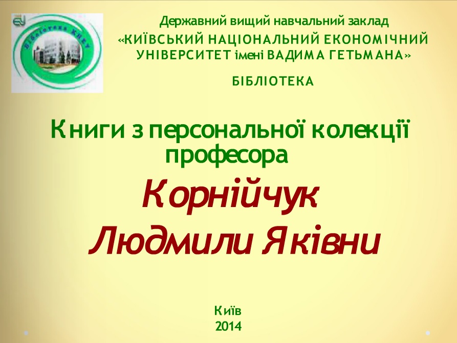 У грудні 2013 р. професор Л. Я. Корнійчук передала в дар до фонду Наукової бібліотеки імені М. В. Довнар-Запольського свою особисту бібліотеку, що складається з видань переважно економічного спрямування. Це перша персональна колекція у фонді бібліотеки.