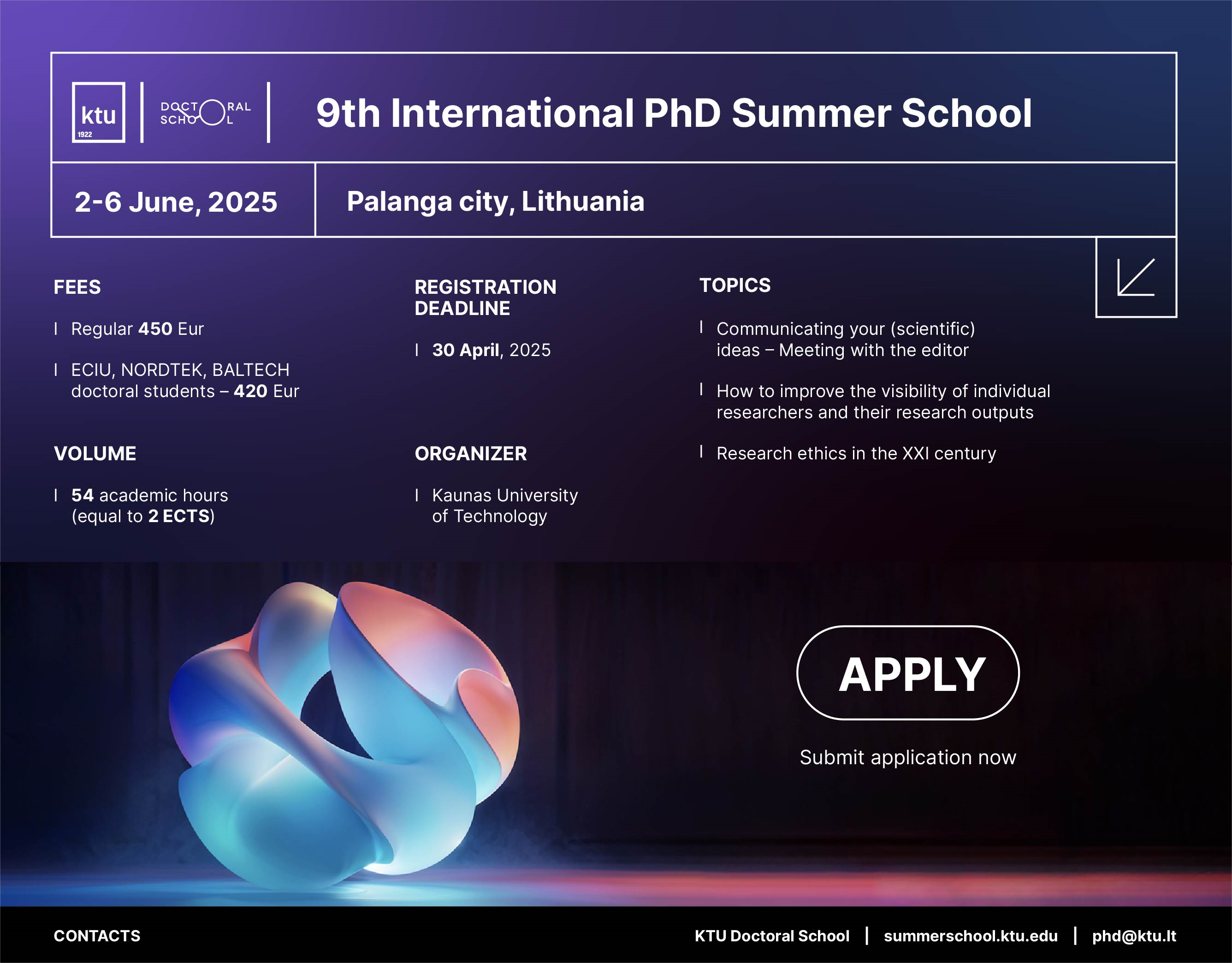 Каунаський технологічний університет (Литва) запрошує докторантів (PhD) взяти участь у 9- й Міжнародній літній школі PhD , яка відбудеться 2-6 червня 2025 року в приморському курортному місті Паланга, Литва.