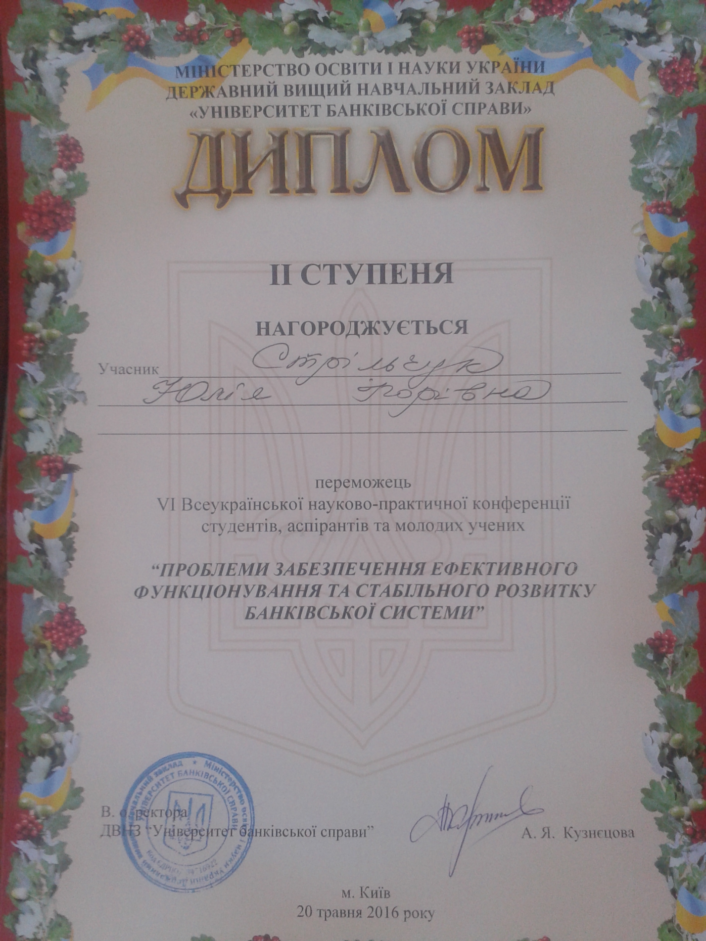 Вітаємо Стрільчук Юлію, апірантку кафедри банківської справи, з перемогою у Всеукраїнській науково-практичній конференції студентів, аспірантів та молодих учених «Проблеми забезпечення ефективного функціонування та стабільного розвитку банківської системи», приуроченої до Дня банківського працівника, яка відбулася 20 травня 2016 року на базі ДВНЗ «Університет банківської справи».
