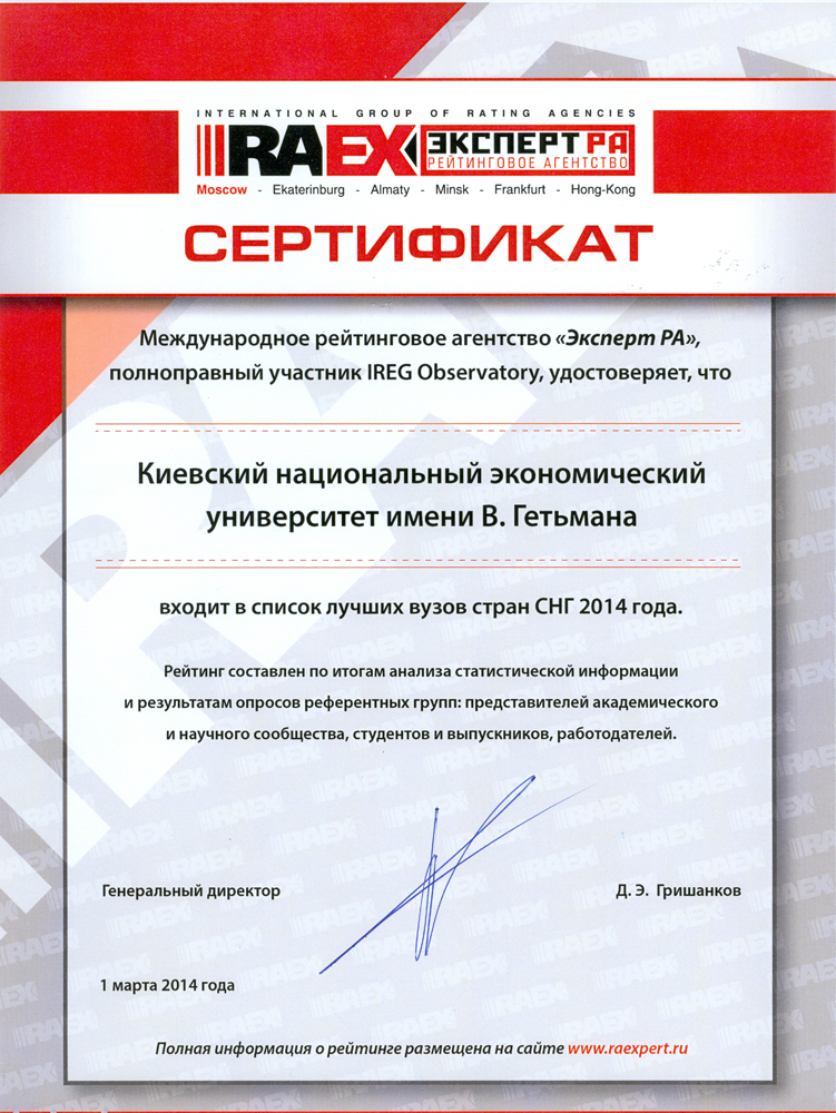 Київський національний економічний університет - кращий університет країн СНД 201412 Травня 2014р.![]() Київський національний економічний університет отримав сертифікат міжнародного рейтингового агентства «Експерт РА», яким засвідчено, що наш університет входить до списку кращих університетів країн СНД. Рейтинг складено в результаті аналізу статистичної інформації та результатів опитувань референтних груп: представників академічного та наукового співтовариств, студентів та випускників, роботодавців. В цьому році «Експерт РА», найбільше російське міжнародне рейтингове агентство, вперше оприлюднило рейтинг вищих навчальних закладів країн СНД, який врахував відмінності та спільні риси систем вищої освіти на пострадянському просторі. Всі 153 ВНЗ, що потрапили до рейтингу, розподілені у 5 рейтингових класів від А до Е, де клас А відповідає виключно високому рівню підготовки випускників (до цього класу потрапив лише 1 університет), клас В – дуже високий рівень (14 університетів з Росії, 3 університети представляють Україну та 1- Білорусь), клас С - високий рівень підготовки випускників (12 університетів з Росії, 5 університети представляють Україну (КНЕУ та 4 інші ВНЗ) та 2 - Білорусь), клас Д – прийнятний рівень підготовки, клас Е - достатній рівень підготовки. Відтак КНЕУ знаходиться у першій п’ятірці університетів України, які на думку «Експерт РА» забезпечують високий рівень підготовки випускників. В основу визначення рейтингового класу авторами закладена методика, яка відштовхується від аналізу інтегральних показників, що характеризують якість знань, навичок та умінь випускників: умови отримання якісної освіти в університеті (вага = 0,5), рівень попиту роботодавців на випускників ВНЗ (вага = 0,3) та рівень науково-дослідницької активності університету (вага = 0,2). Підготував Ільницький Д.О. |