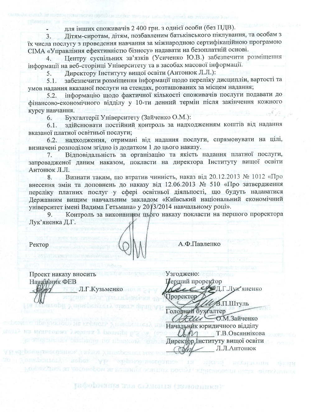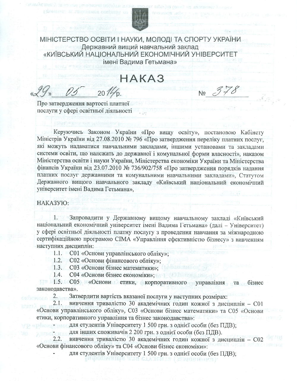 У ДВНЗ «Київський національний економічний університет імені Вадима Гетьмана» у сфері освітньої діяльності запроваджено платну послугу з проведення навчання за міжнародною сертифікаційною програмою СІМА «Управління ефективністю бізнесу» з вивченням наступних дисциплін: