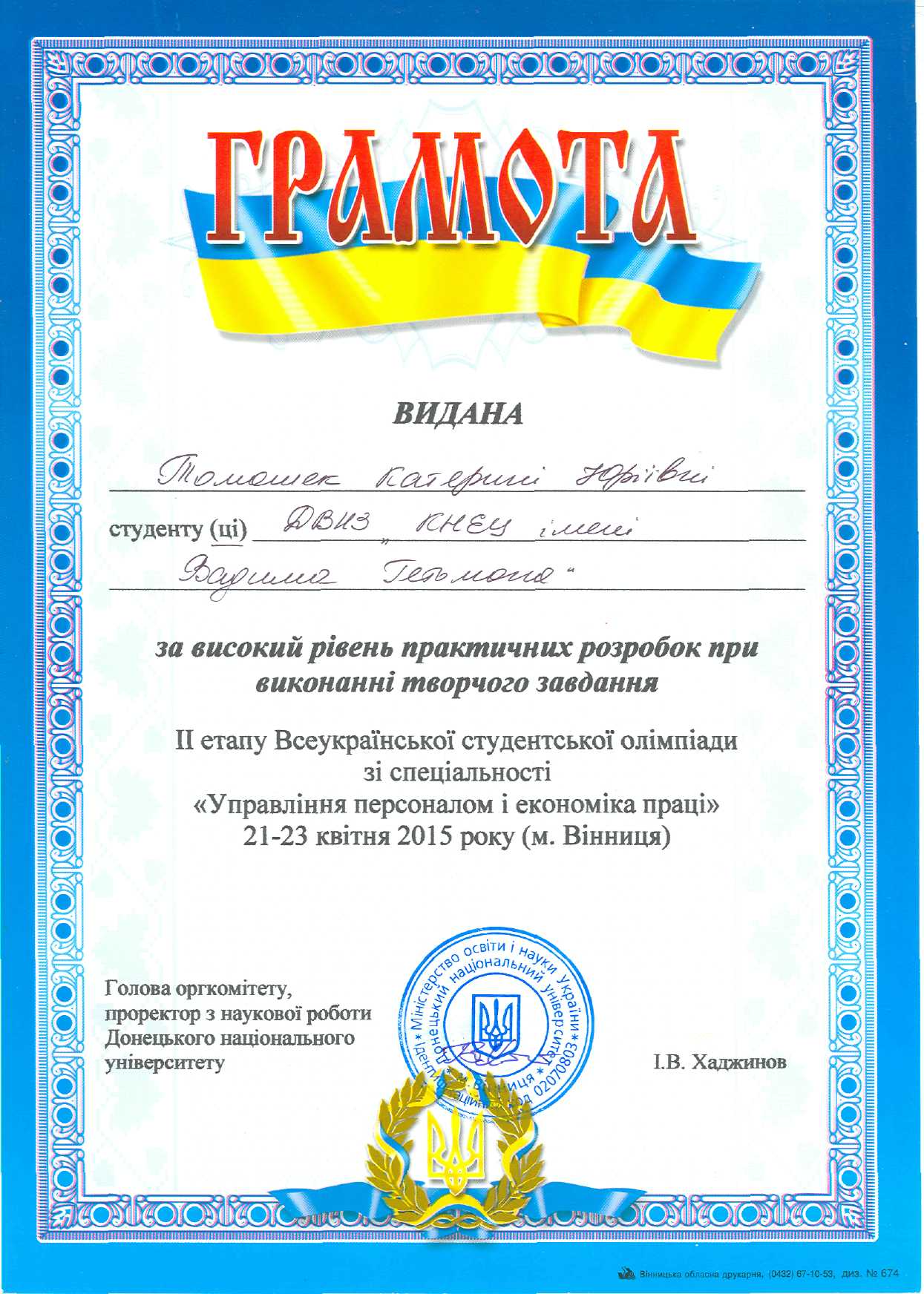 22 квітня 2015 року відбувся II тур Всеукраїнської олімпіади зі спеціальності «Управління персоналом та економіка праці», який проходив у місті Вінниця. Учасників олімпіади приймав Донецький національний університет. Від Київського національного економічного університету імені Вадима Гетьмана в олімпіаді брали участь студентки 4 курсу: Катерина Томашек, Анастасія Зайцева, Ірина Прокопчук. Завдання були складні і проходили в два етапи, на виконання яких було відведено 5 годин.