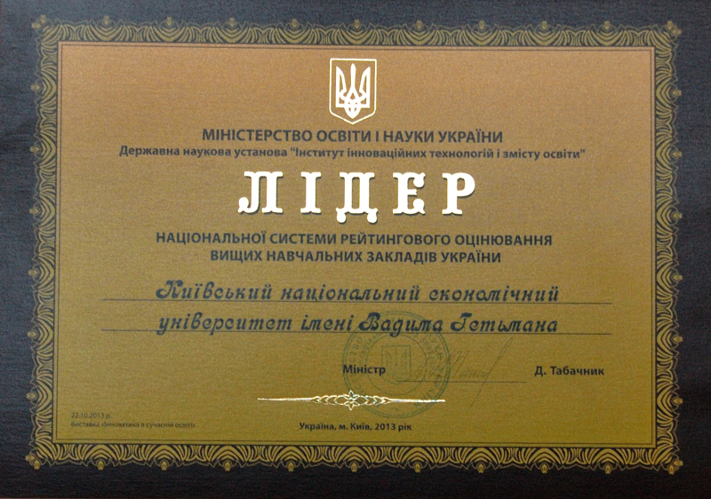 22 жовтня 2013 року Київський національний економічний університет імені Вадима Гетьмана отримав звання «Лідер національної системи рейтингового оцінювання вищих навчальних закладів України»