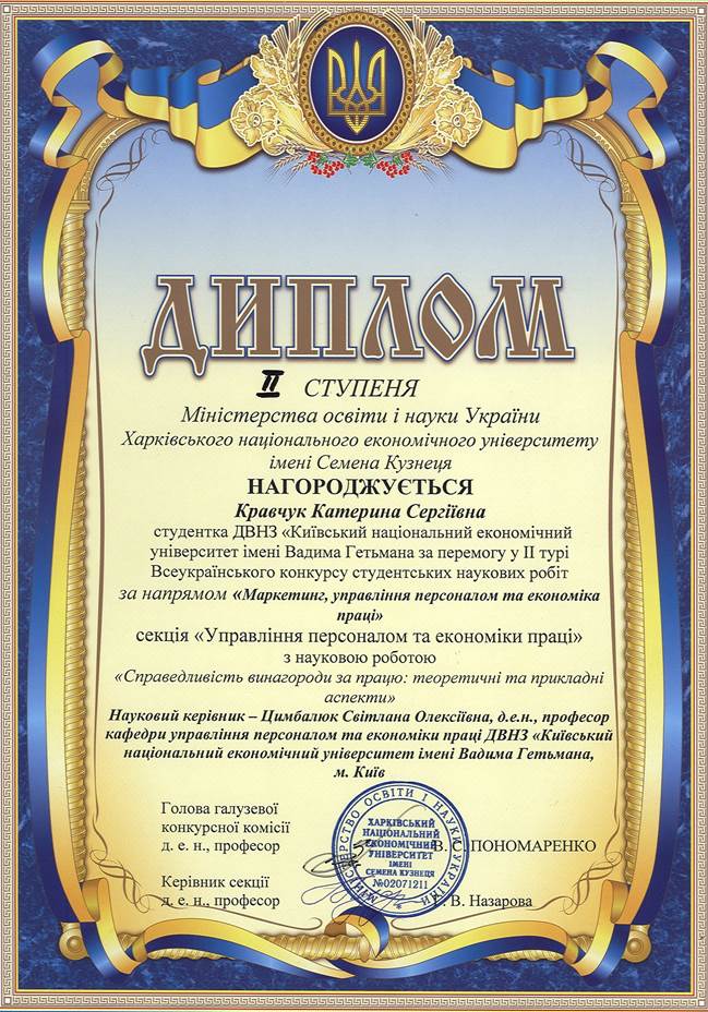 За результатами конференції Галузева конкурсна комісія нагородила Дипломом ІІ ступеня Конкурсу Кравчук Катерину Сергіївну за дослідження на тему «Справедливість винагороди за працю: теоретичні та прикладні аспекти» (науковий керівник – д.е.н., проф. Цимбалюк С.О.).